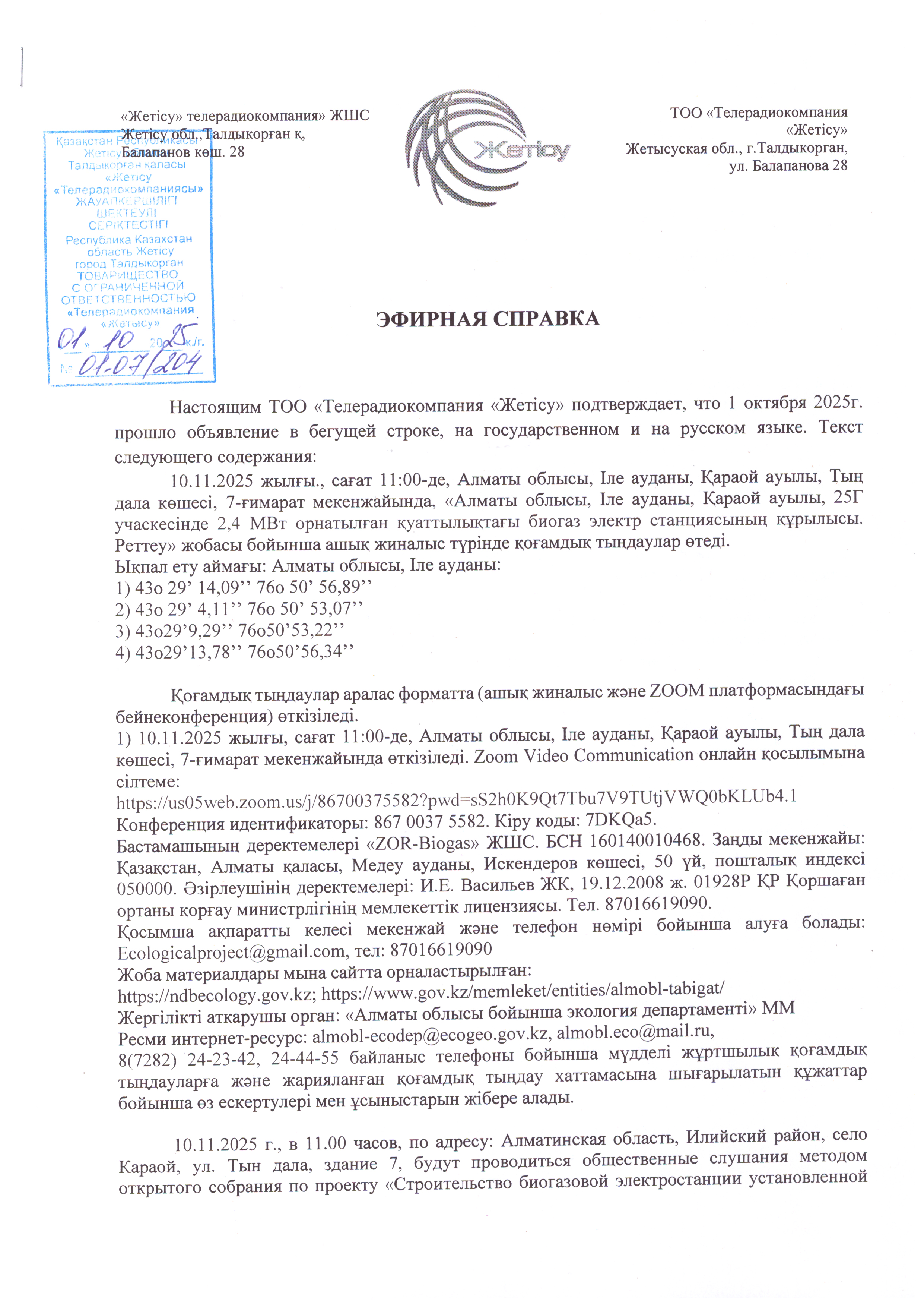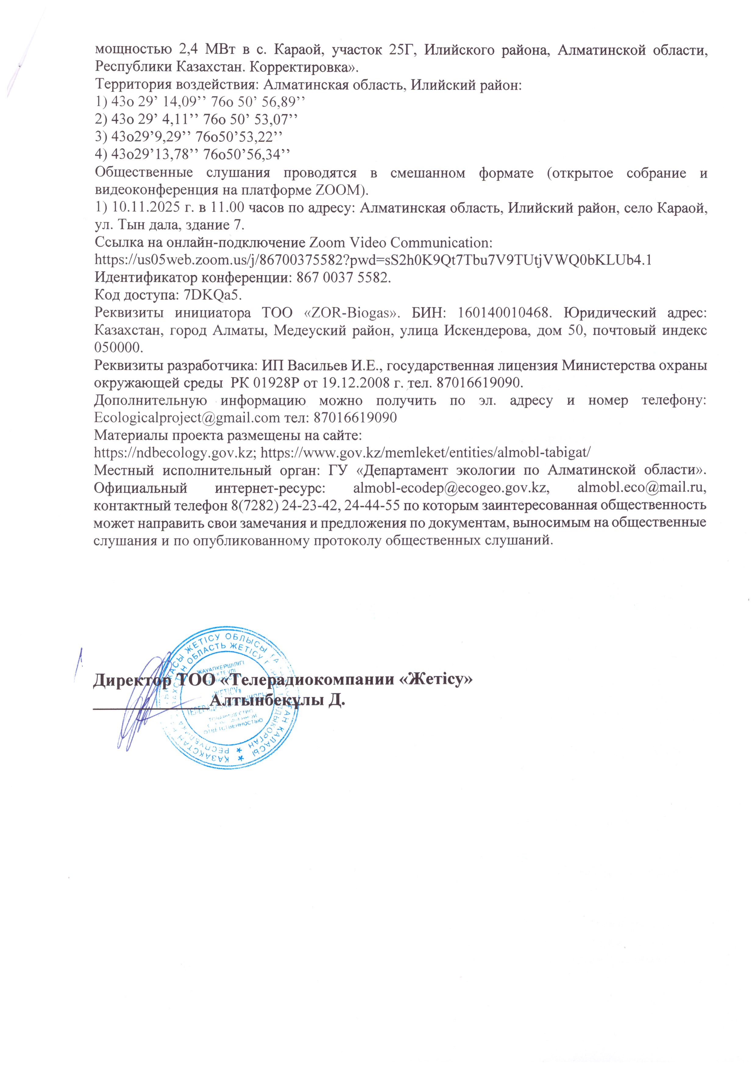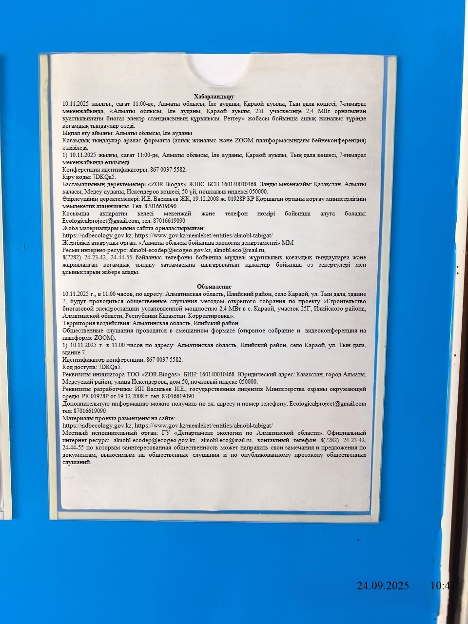 4. Повестка дня общественных слушаний: Строительство биогазовой электростанции установленной мощностью 2,4 МВт в с. Караой, участок 25Г, Илийского района, Алматинской области, Республики Казахстан. Корректировка