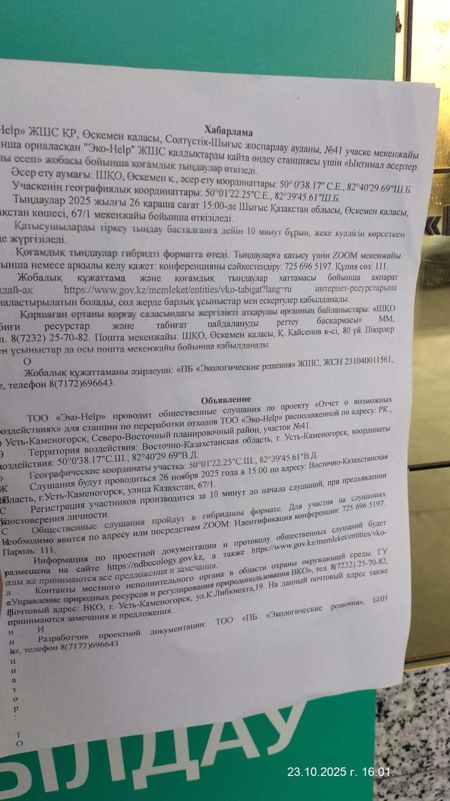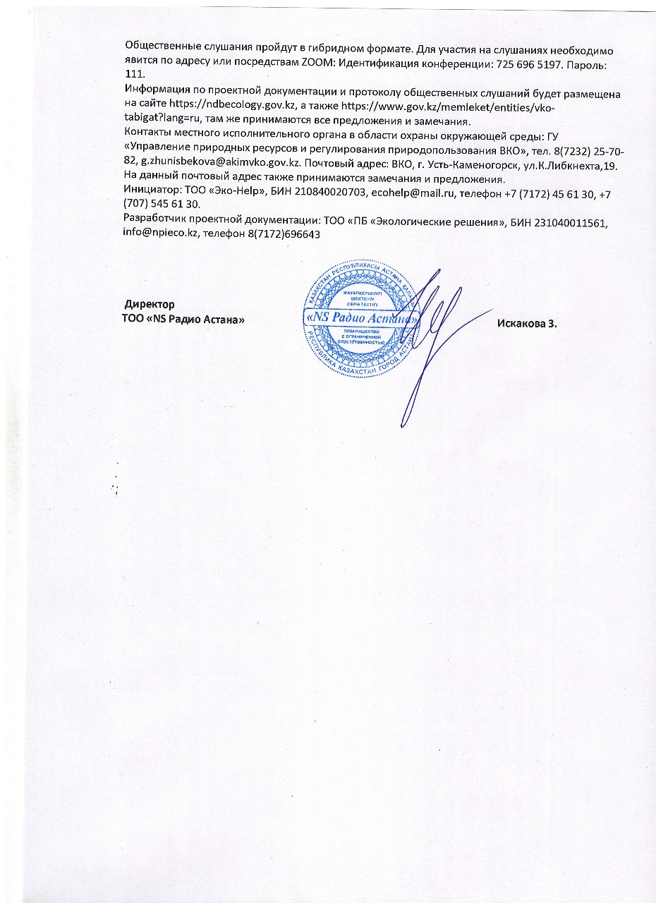 3. Общественные слушания организованны: Управление природных ресурсов и регулирования природопользования Восточно-Казахстанской области, g.zhunisbekova@akimvko.gov.kz,