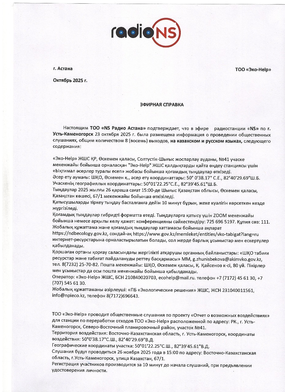 По проекту: Проект "Отчет о возможных воздействиях" для станции по переработки отходов ТОО «Эко-Help» расположенной по адресу: РК., г. Усть-Каменогорск, Северо-Восточный планировочный район, участок №41