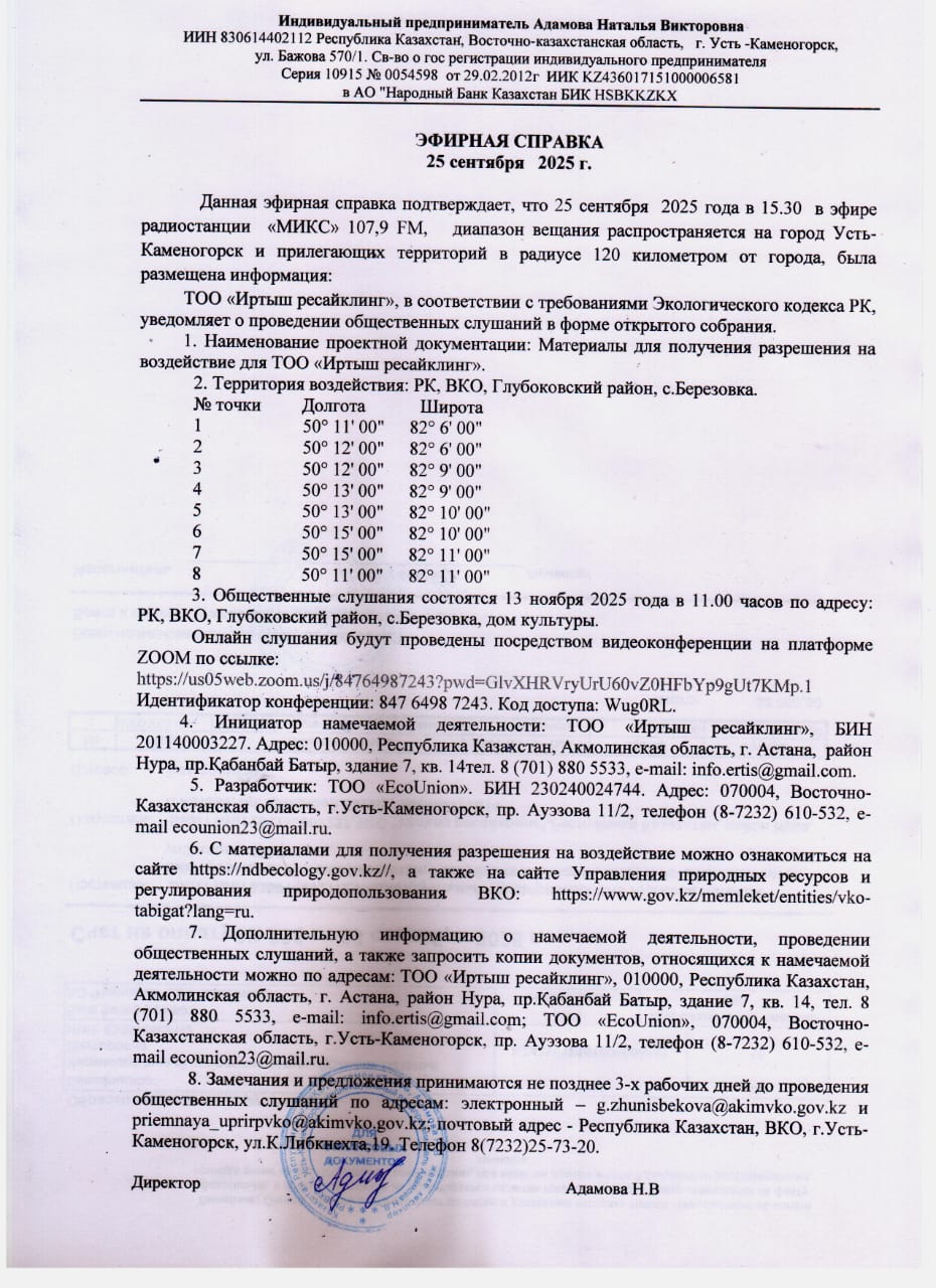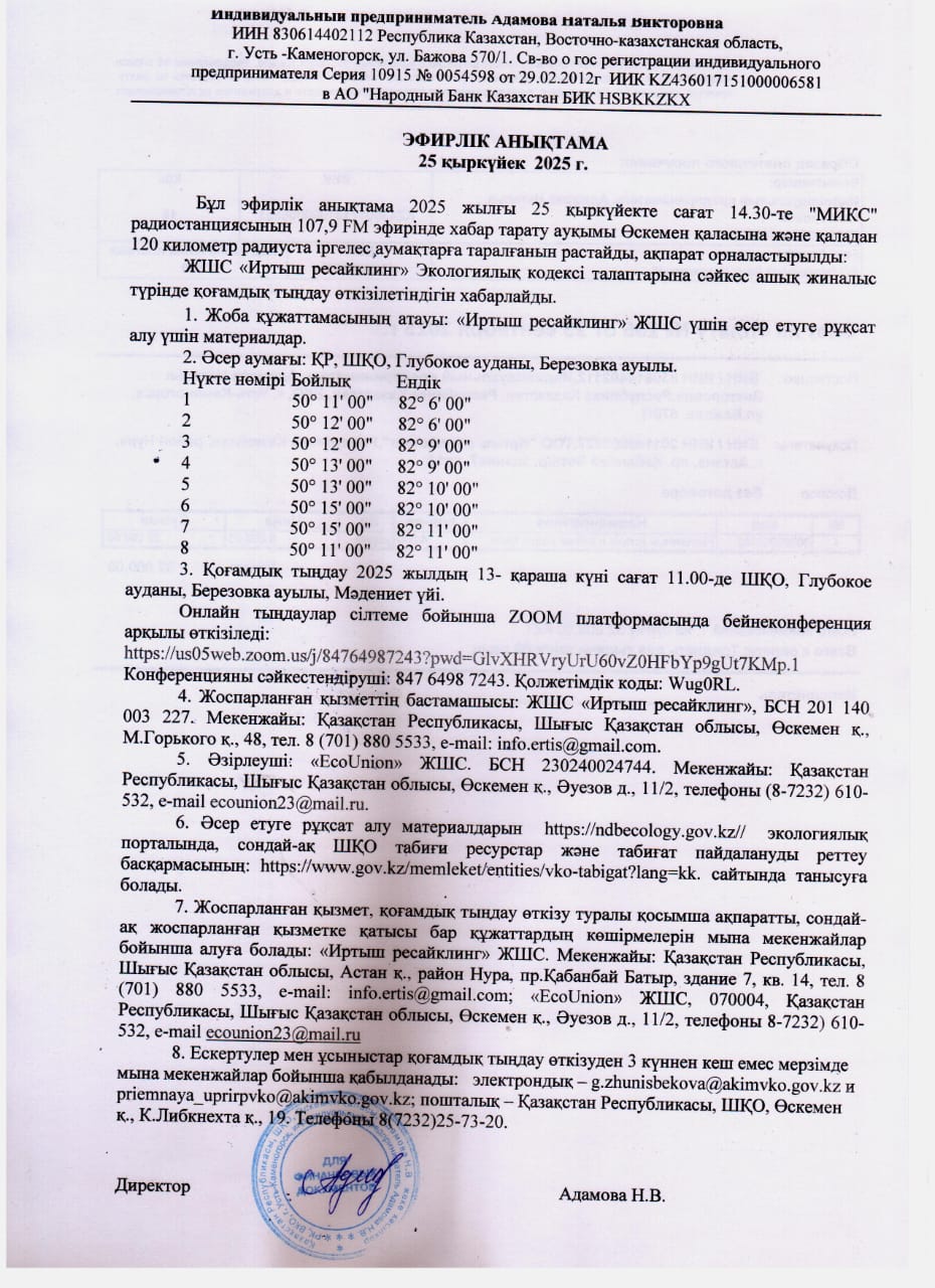 3. Общественные слушания организованны: Управление природных ресурсов и регулирования природопользования Восточно-Казахстанской области, g.zhunisbekova@akimvko.gov.kz,