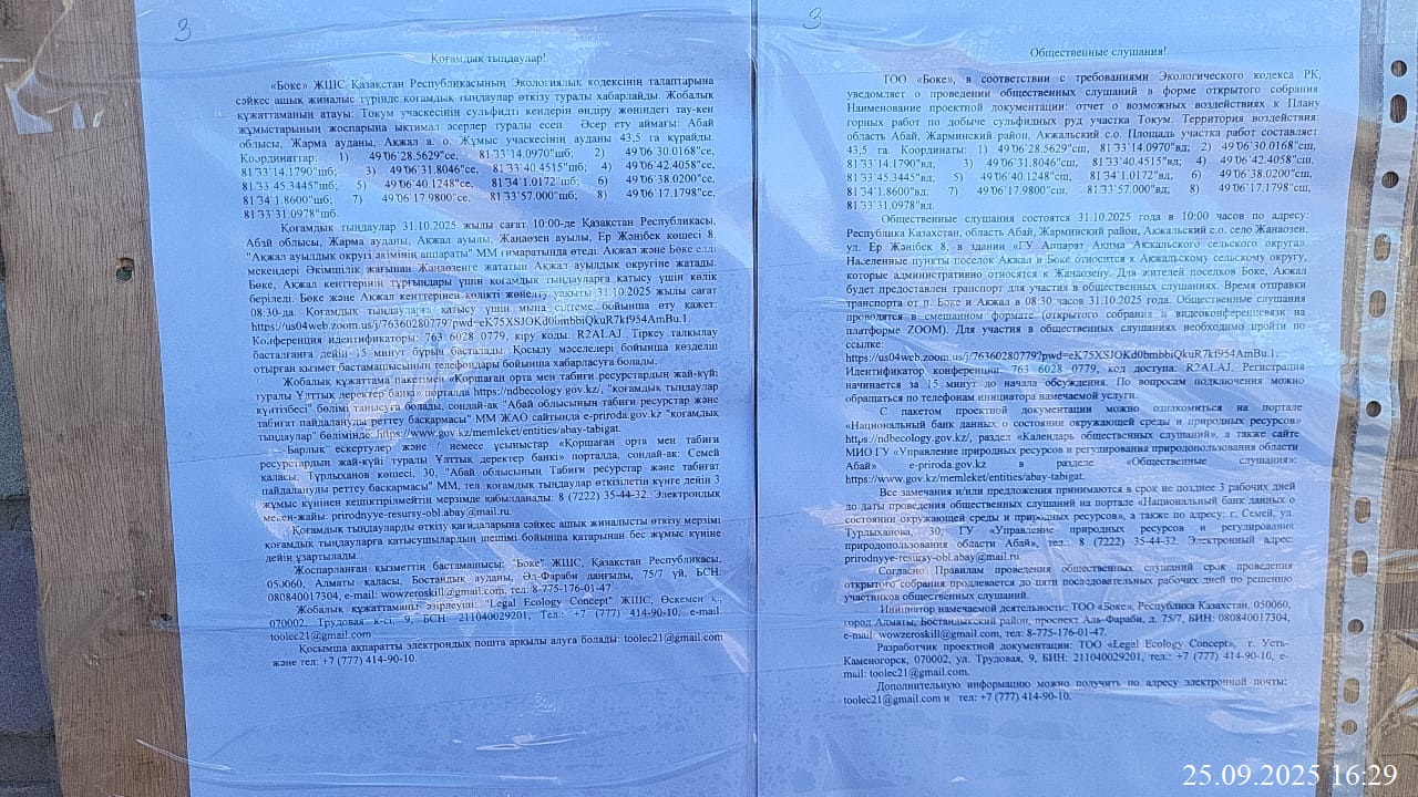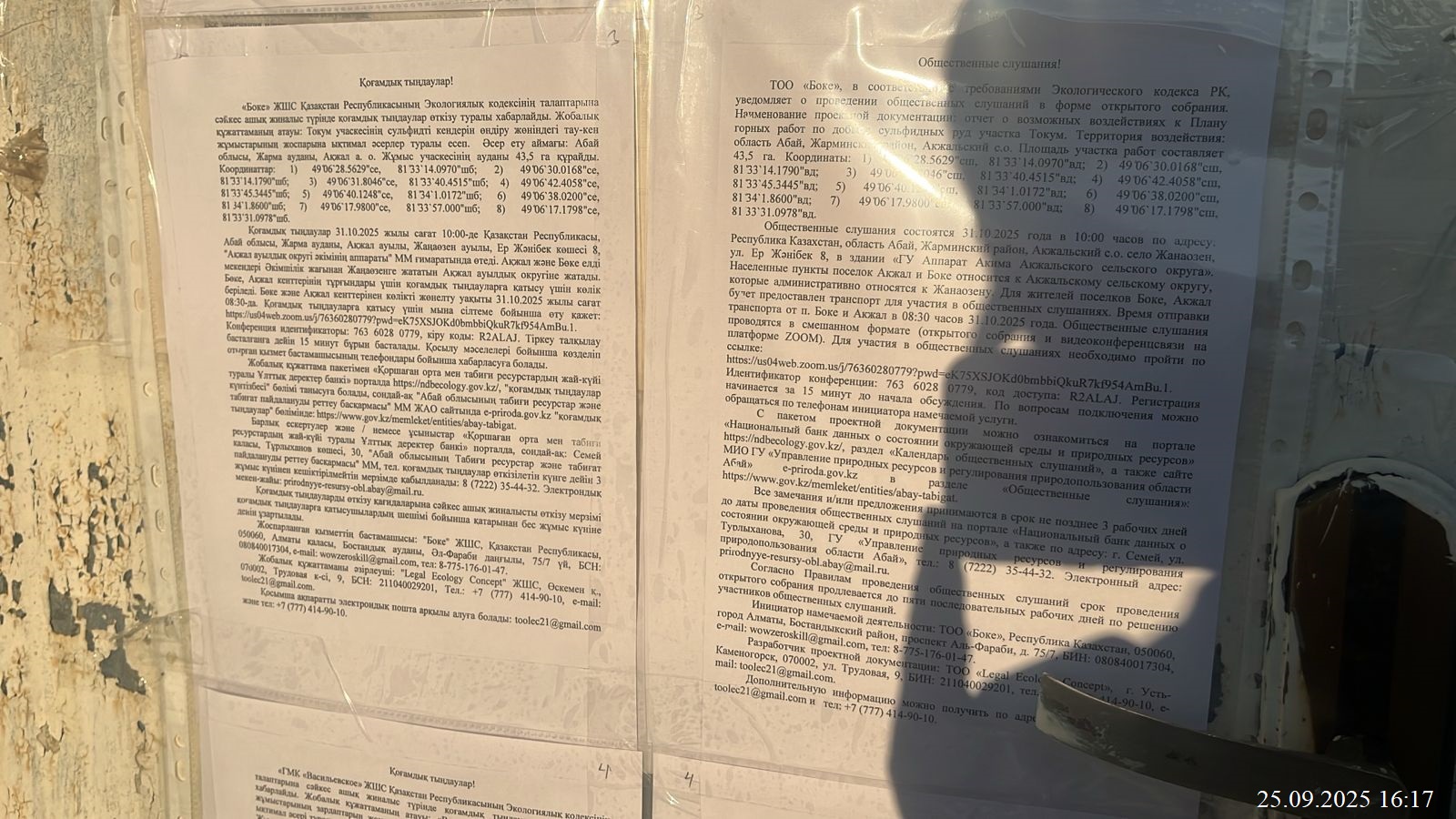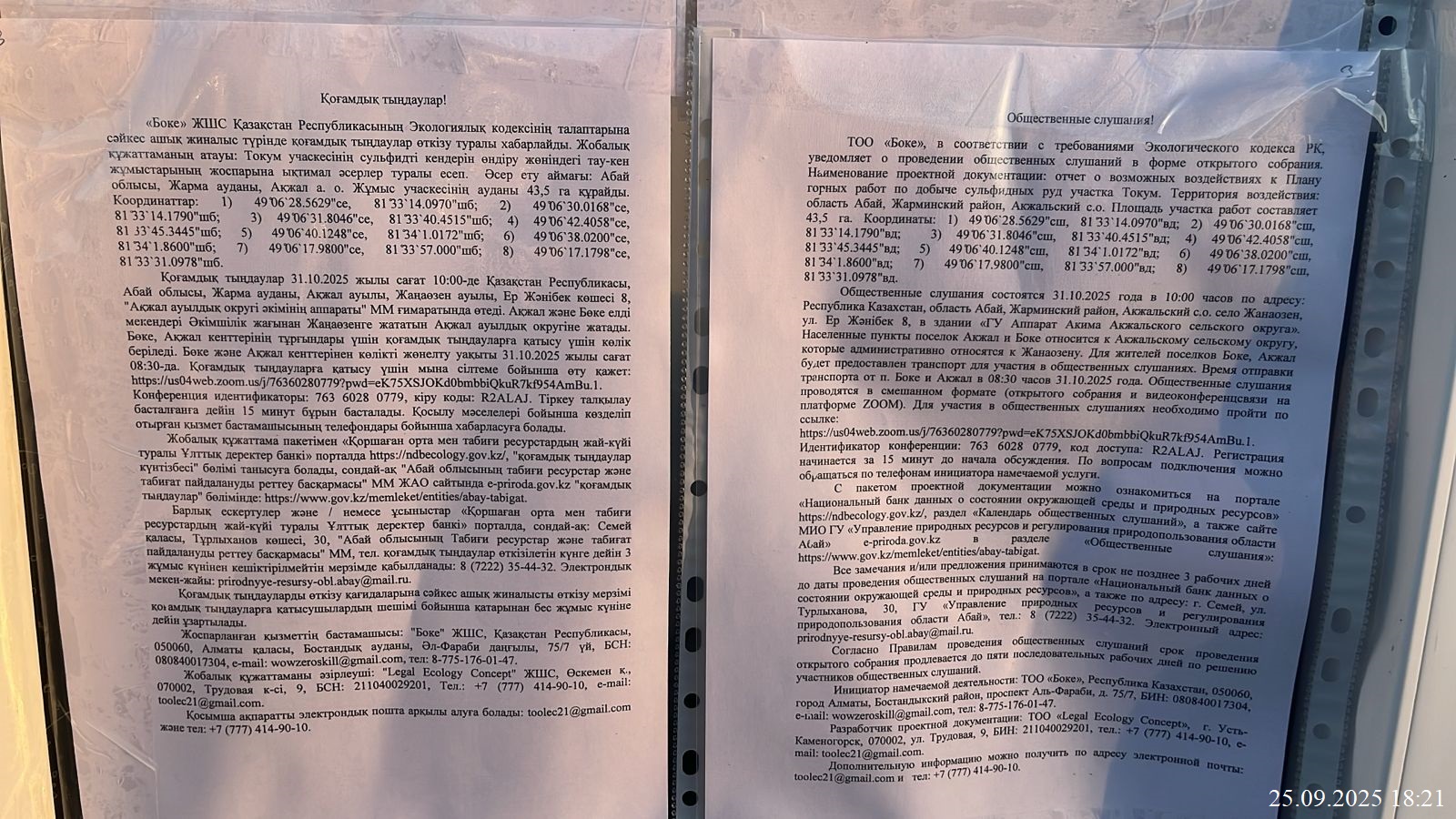 3. Общественные слушания организованны: Главный специалист УПР и ПР область Абай, prirodnyye_resursy_obl.abay@mail.ru,