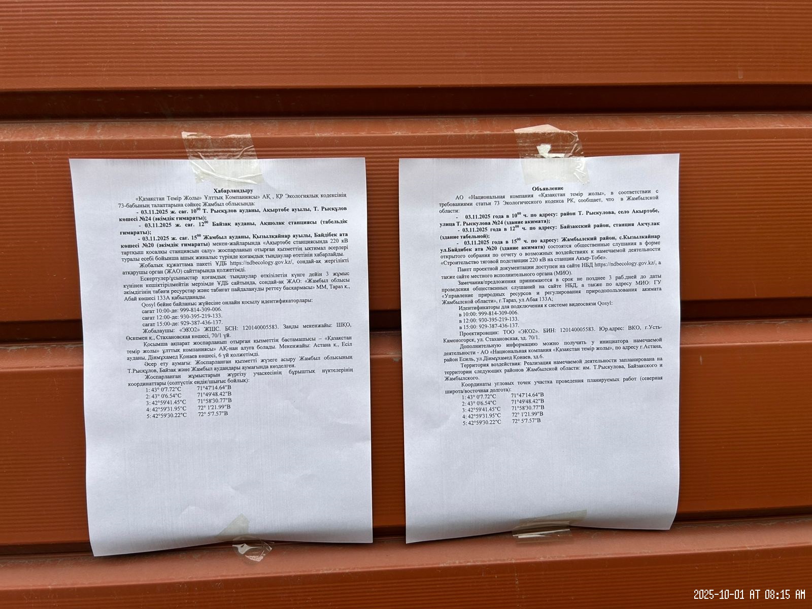 6. Объявление о проведении общественных слушаний на казахском и русском языках будет распространено следующими способами: