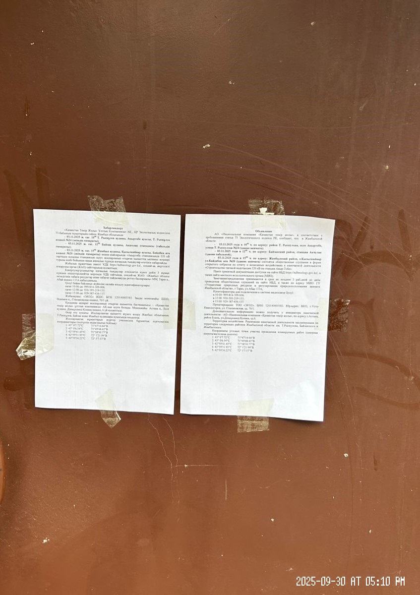 4. Повестка дня общественных слушаний: Проектом предусматривается строительство новой тяговой подстанции ПС 220/55(2х27,5)/10кВ «Акыр-Тобе» вблизи железнодорожной станции Акыр-Тобе, Жамбылского отделения АО «НК «КТЖ».