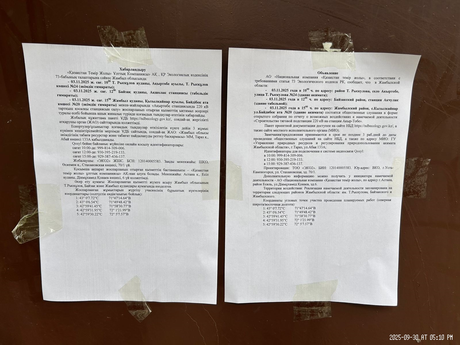 6. Объявление о проведении общественных слушаний на казахском и русском языках будет распространено следующими способами: