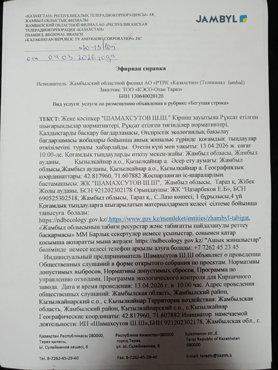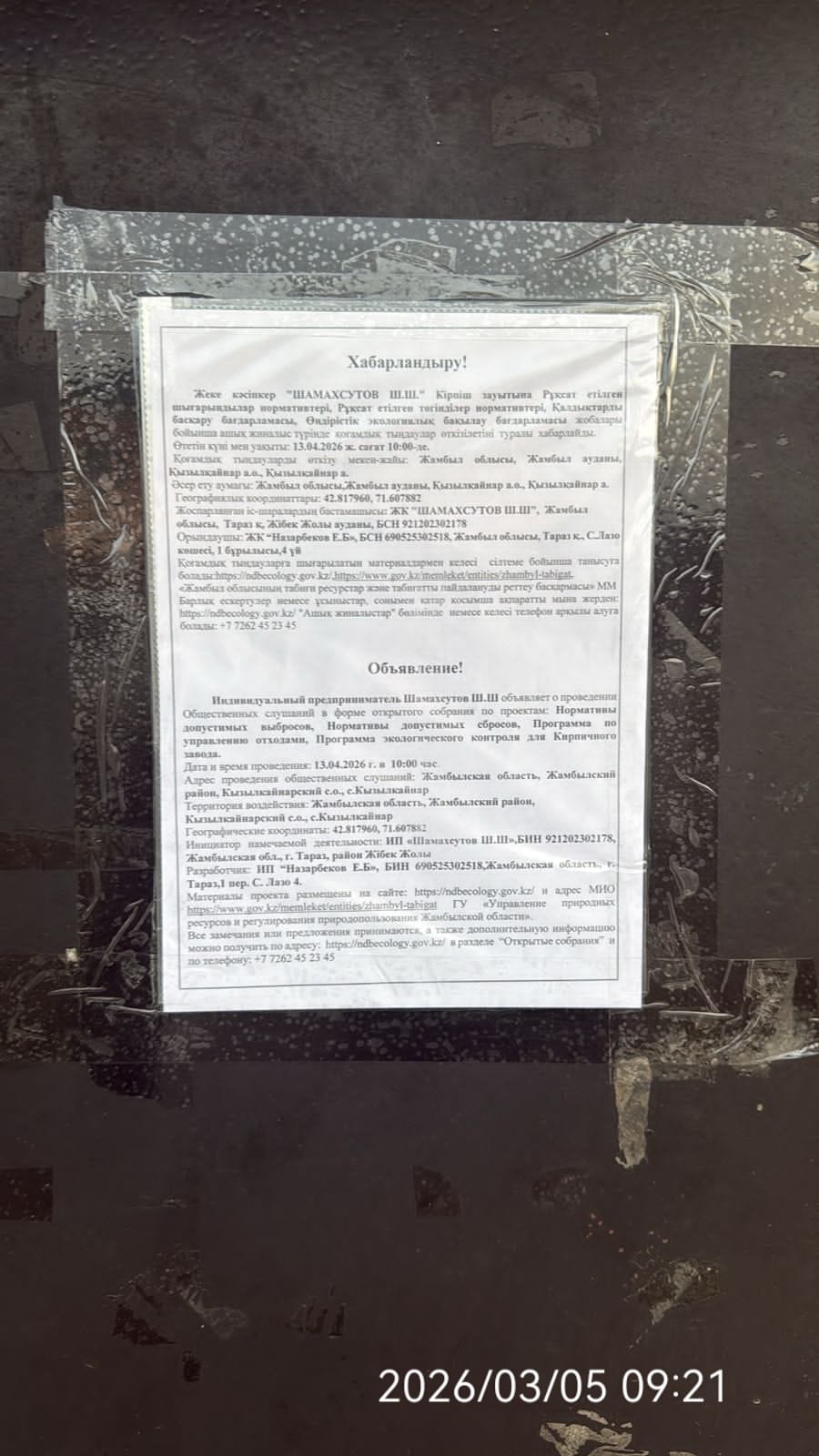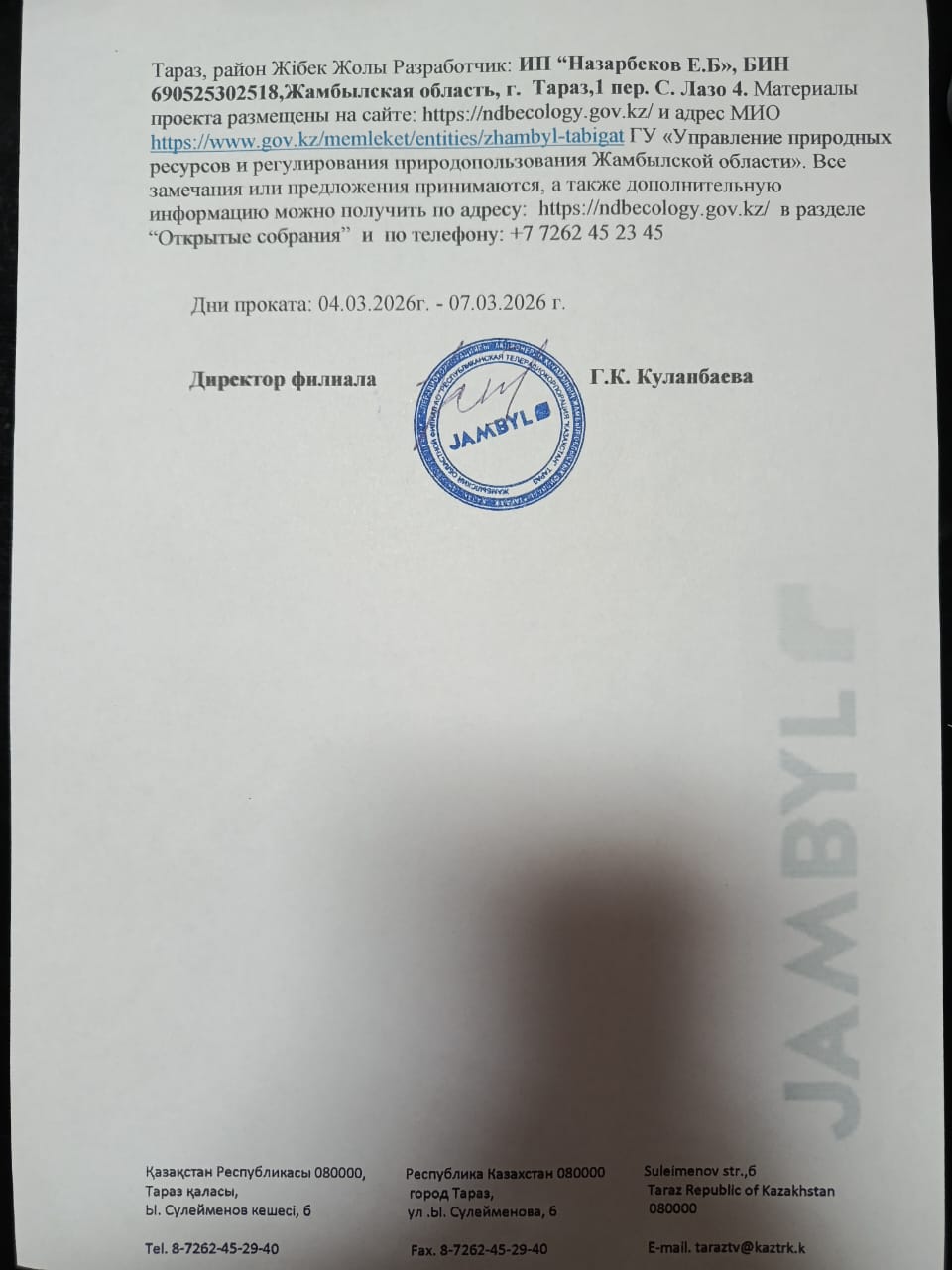 3. Общественные слушания организованны: Управление природных ресурсов и регулирования природопользования Жамбылской области, s.agabek@zhambyl.gov.kz,