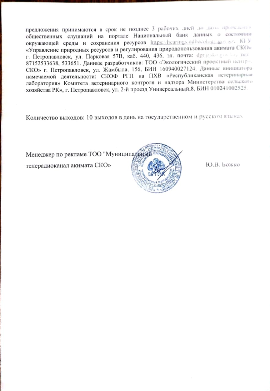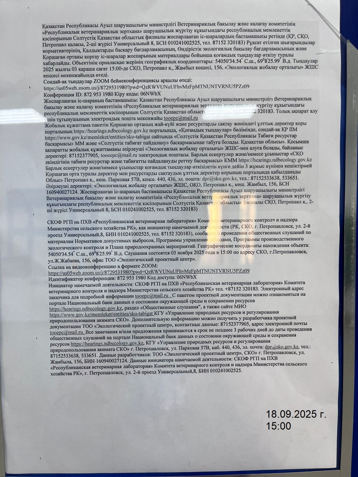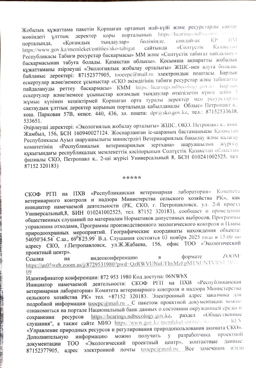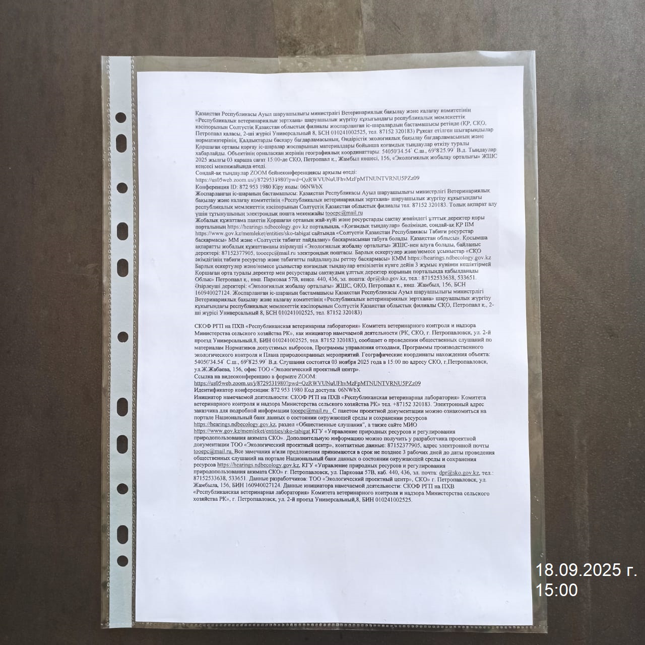 3. Общественные слушания организованны: Управление природных ресурсов и регулирования природопользования Северо-Казахстанской области, e.aitzhanov@sko.gov.kz,