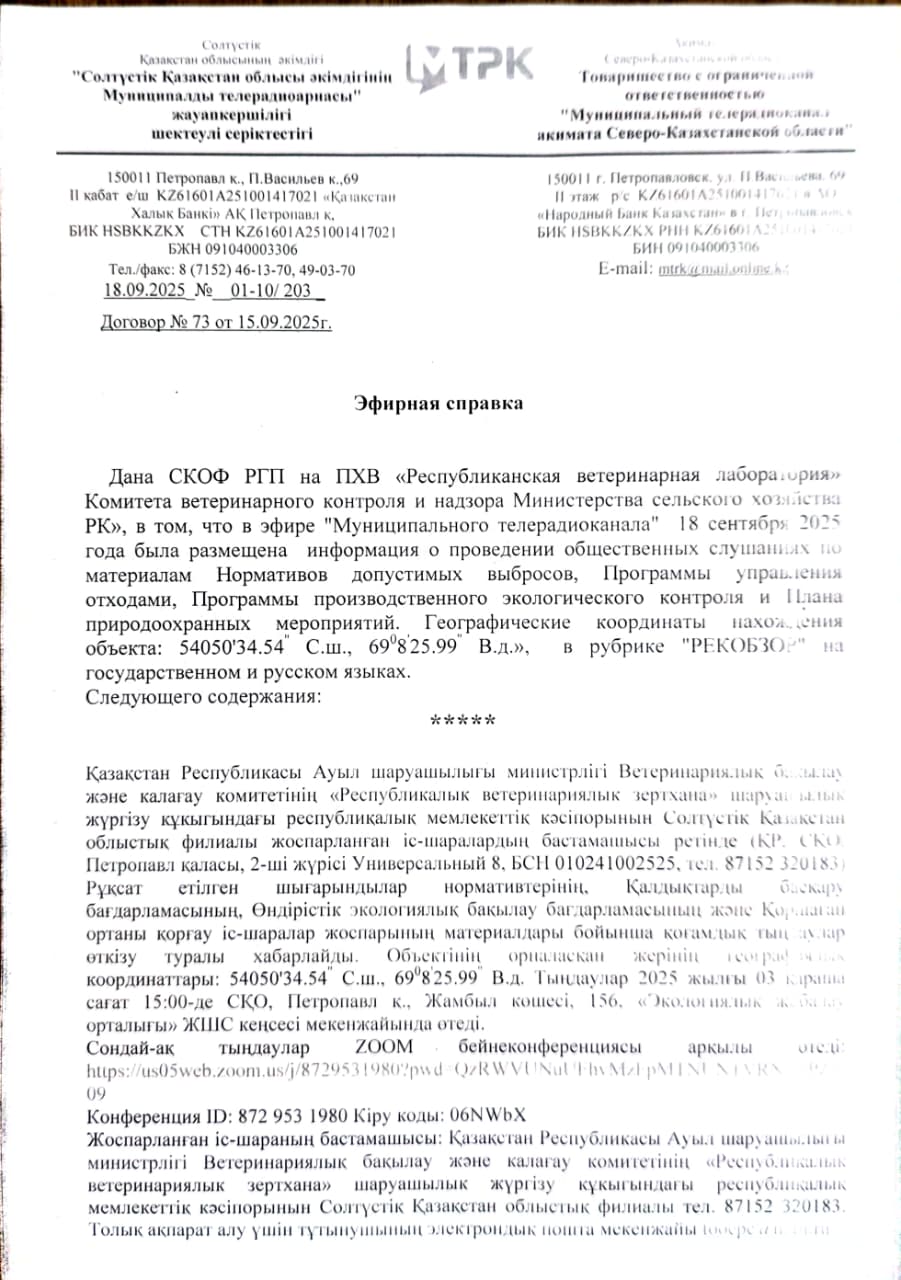 По проекту: Нормативы допустимых выбросов, Программа управления отходами, Программа производственного экологического контроля и План природоохранных мероприятий СКОФ РГП на ПХВ "Республиканская ветеринарная лаборатория"