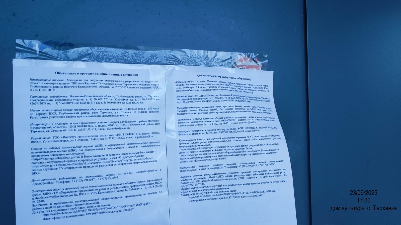 3. Общественные слушания организованны: Управление природных ресурсов и регулирования природопользования Восточно-Казахстанской области, g.zhunisbekova@akimvko.gov.kz,