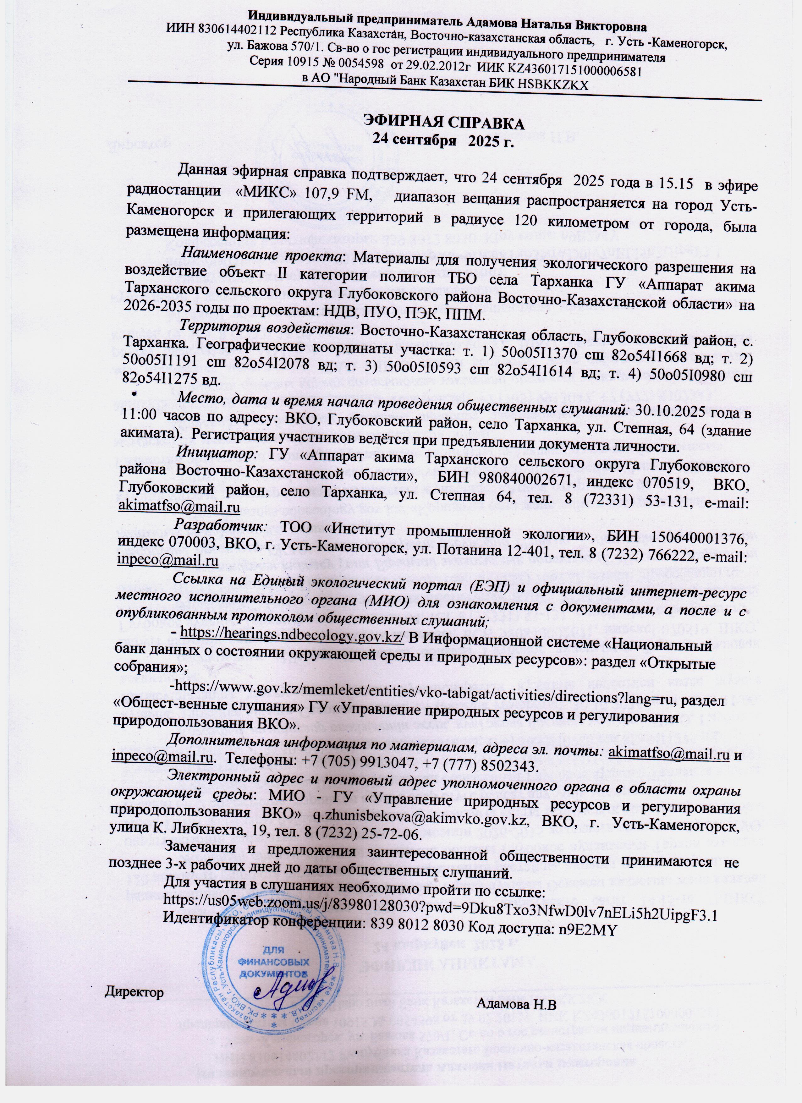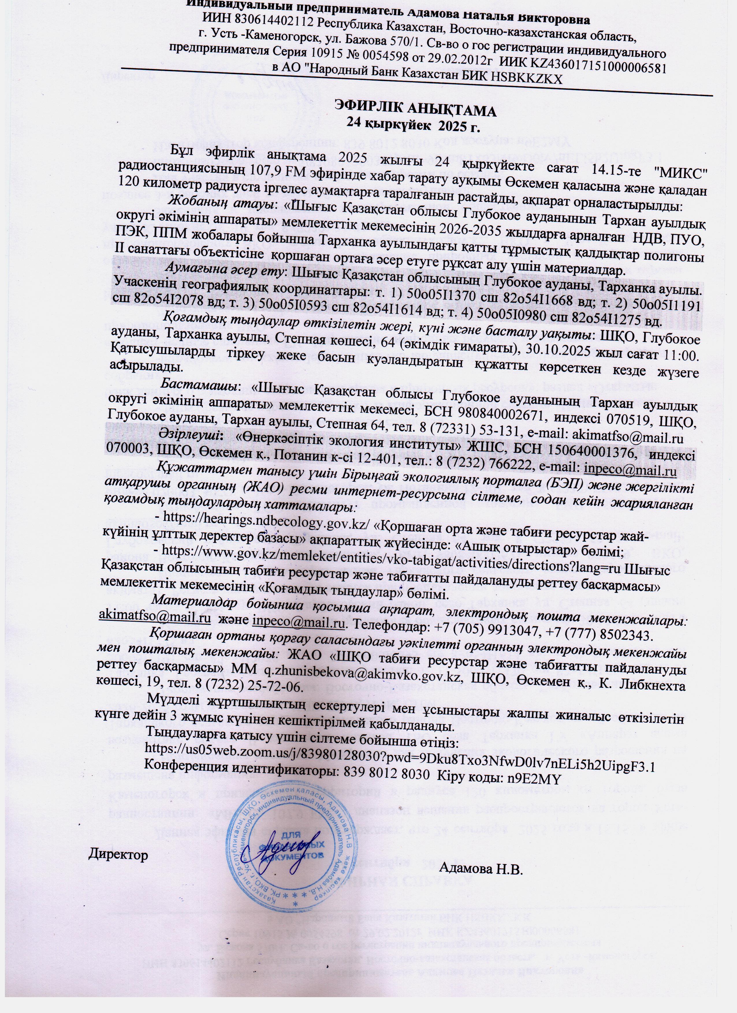 По проекту: Материалы для получения экологического разрешения на воздействие объект II категории полигон ТБО села Тарханка ГУ «Аппарат акима Тарханского сельского округа Глубоковского района Восточно-Казахстанской области» на 2026-2035 годы по проектам: НДВ, ПУО, ПЭК, ППМ.
