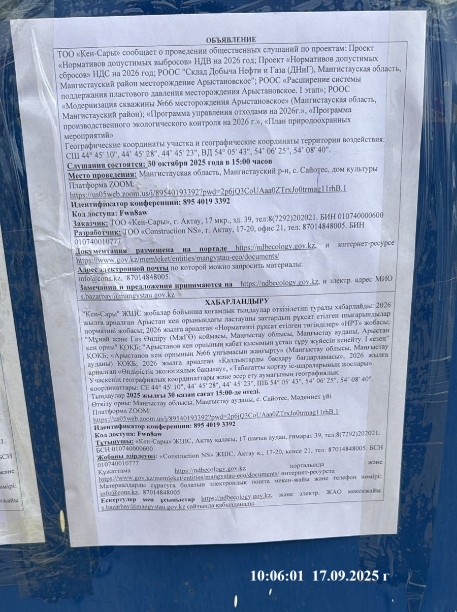 3. Общественные слушания организованны: Управление природных ресурсов и регулирования природопользования Мангистауской области, s.bazarbay@mangystau.gov.kz,