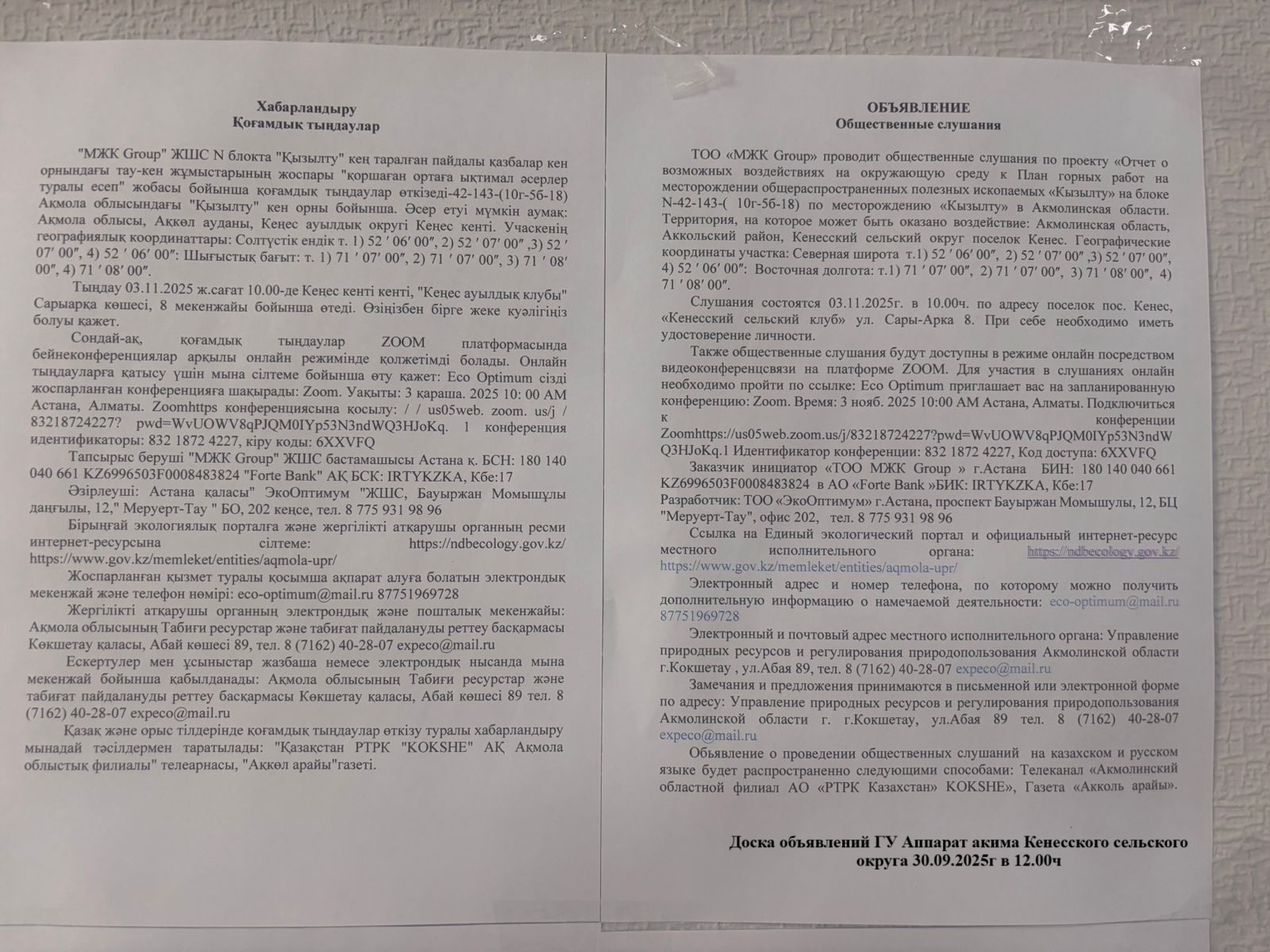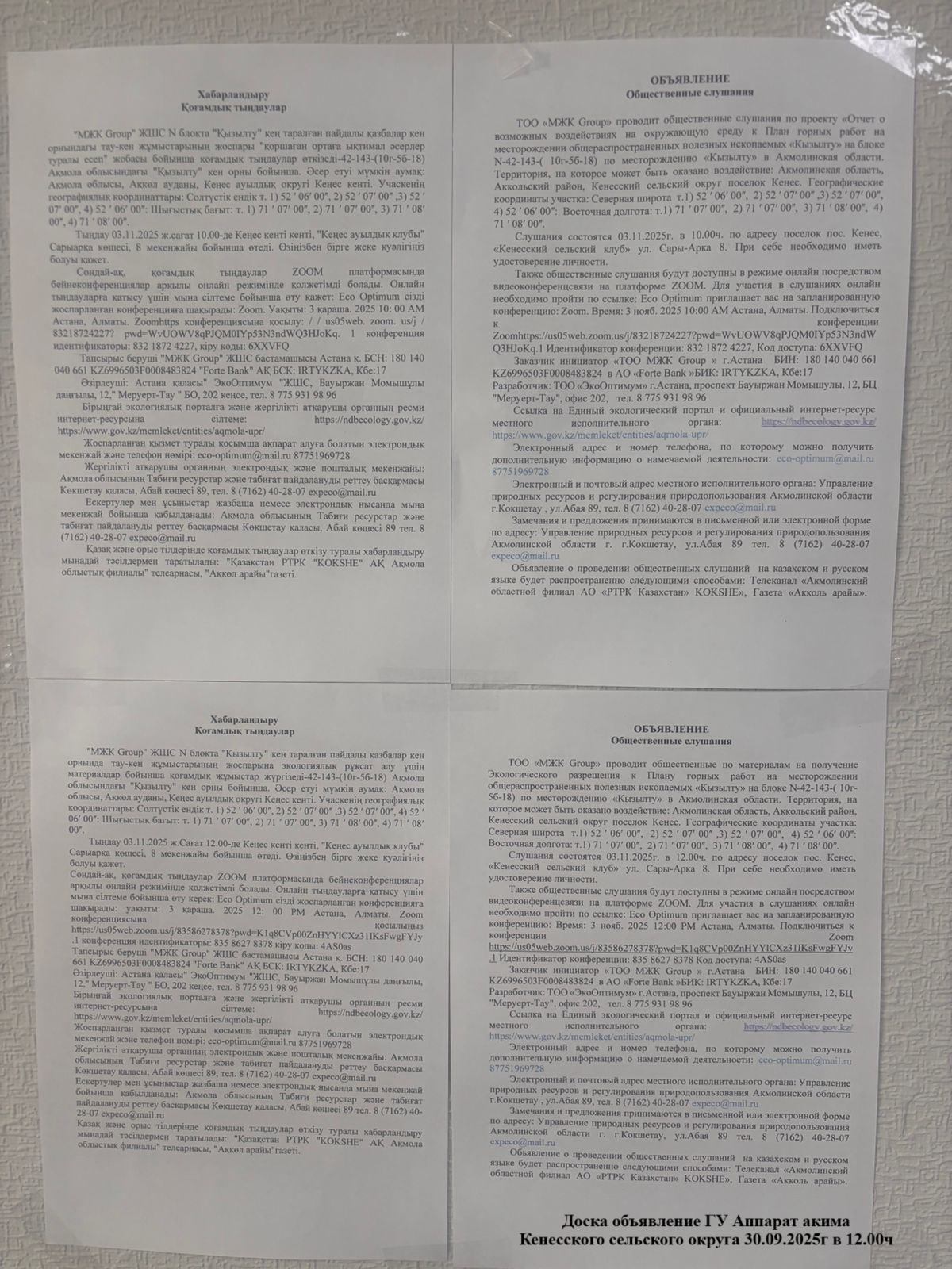 3. Общественные слушания организованны: Управление природных ресурсов и регулирования природопользования Акмолинской области, expeco@mail.ru,