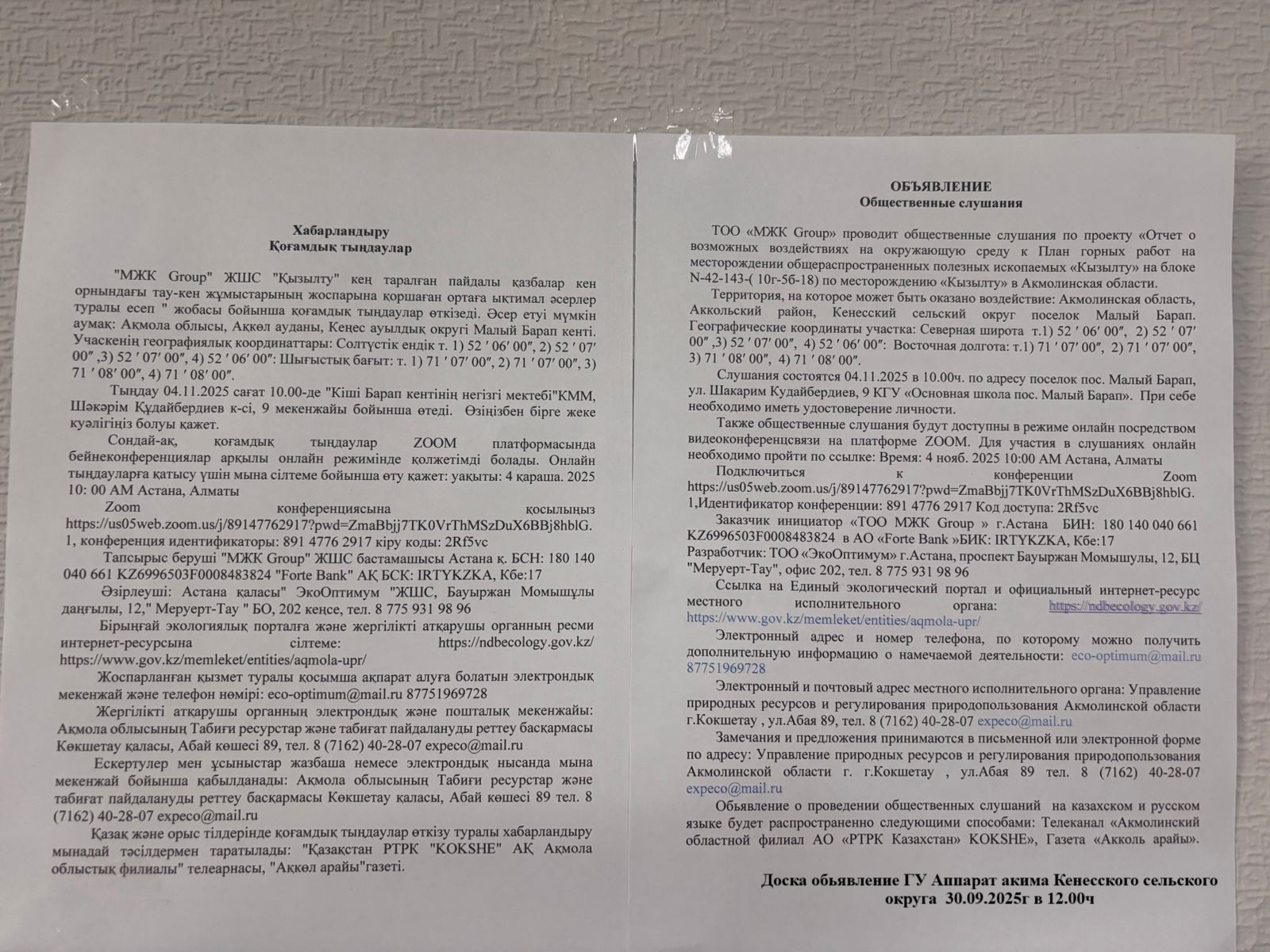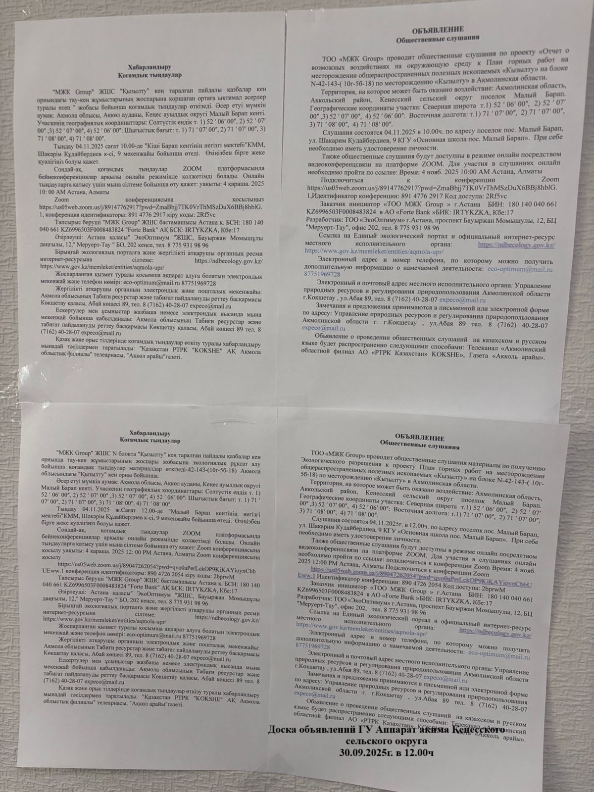 3. Общественные слушания организованны: Управление природных ресурсов и регулирования природопользования Акмолинской области, expeco@mail.ru,