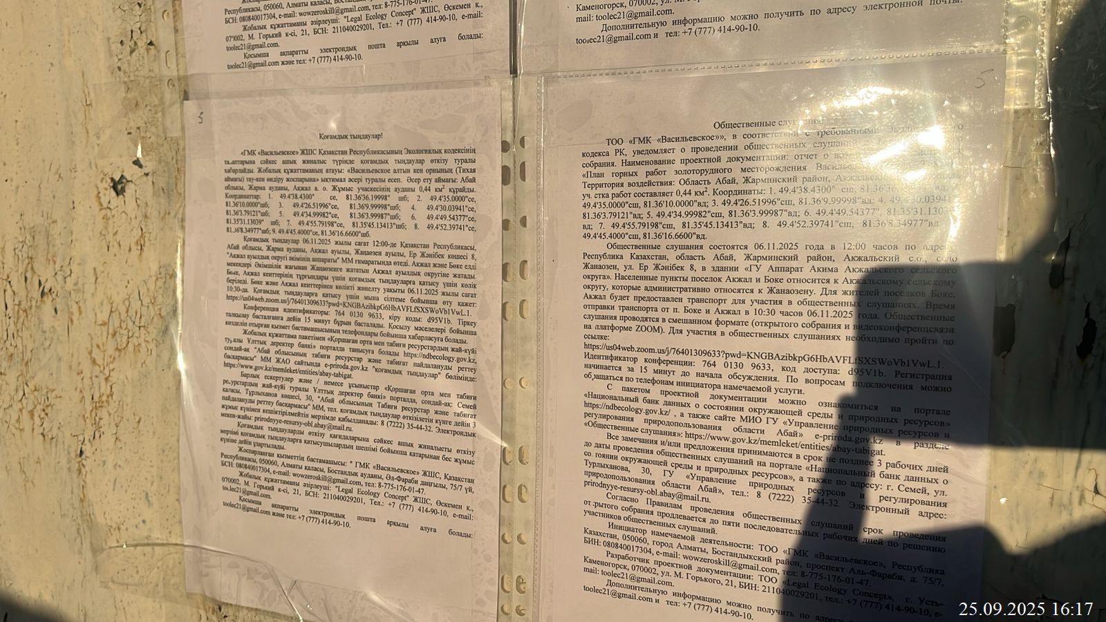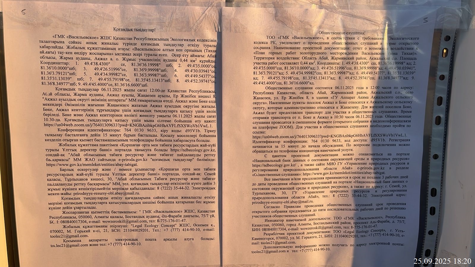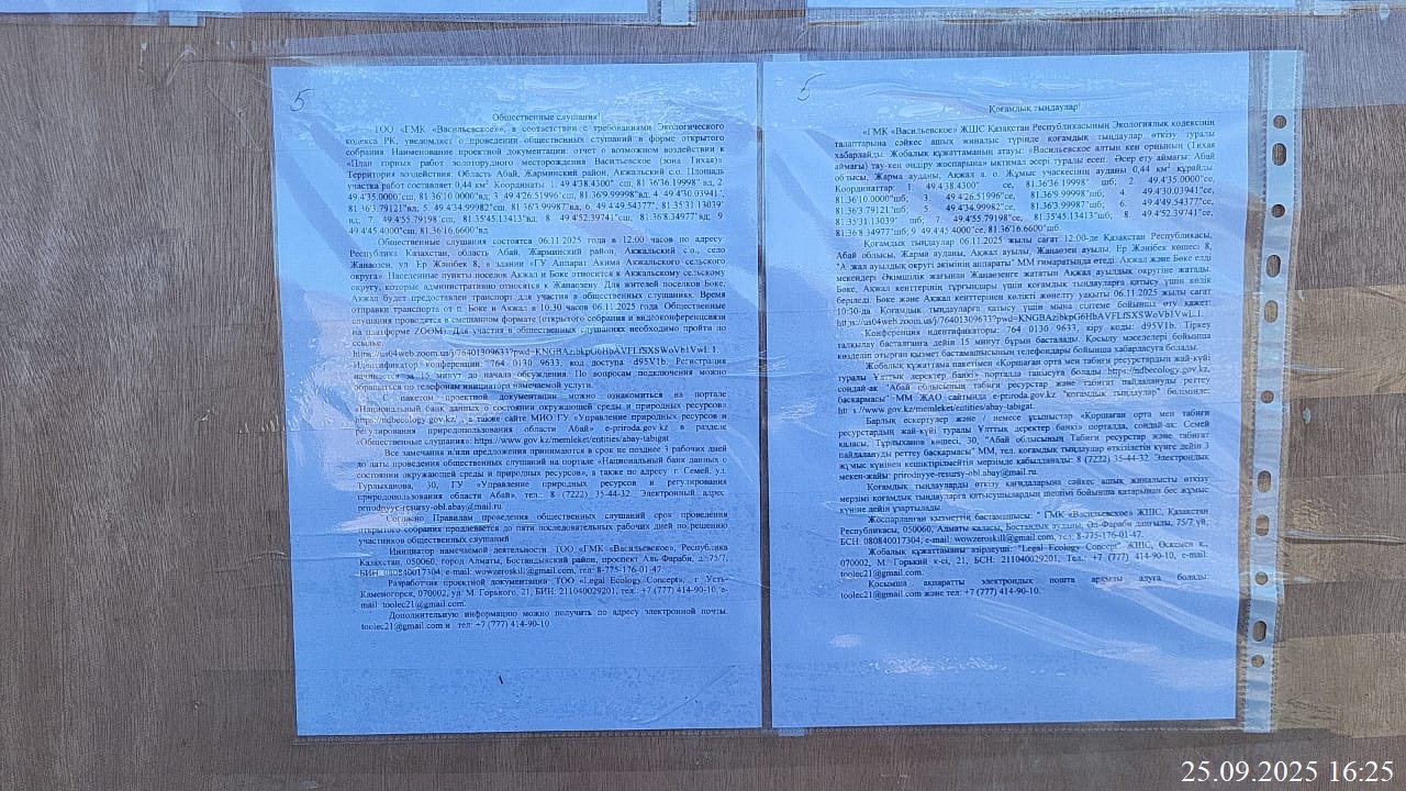 3. Общественные слушания организованны: Главный специалист УПР и ПР область Абай, prirodnyye_resursy_obl.abay@mail.ru,