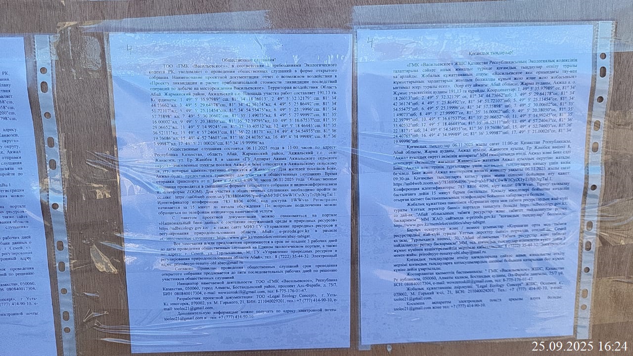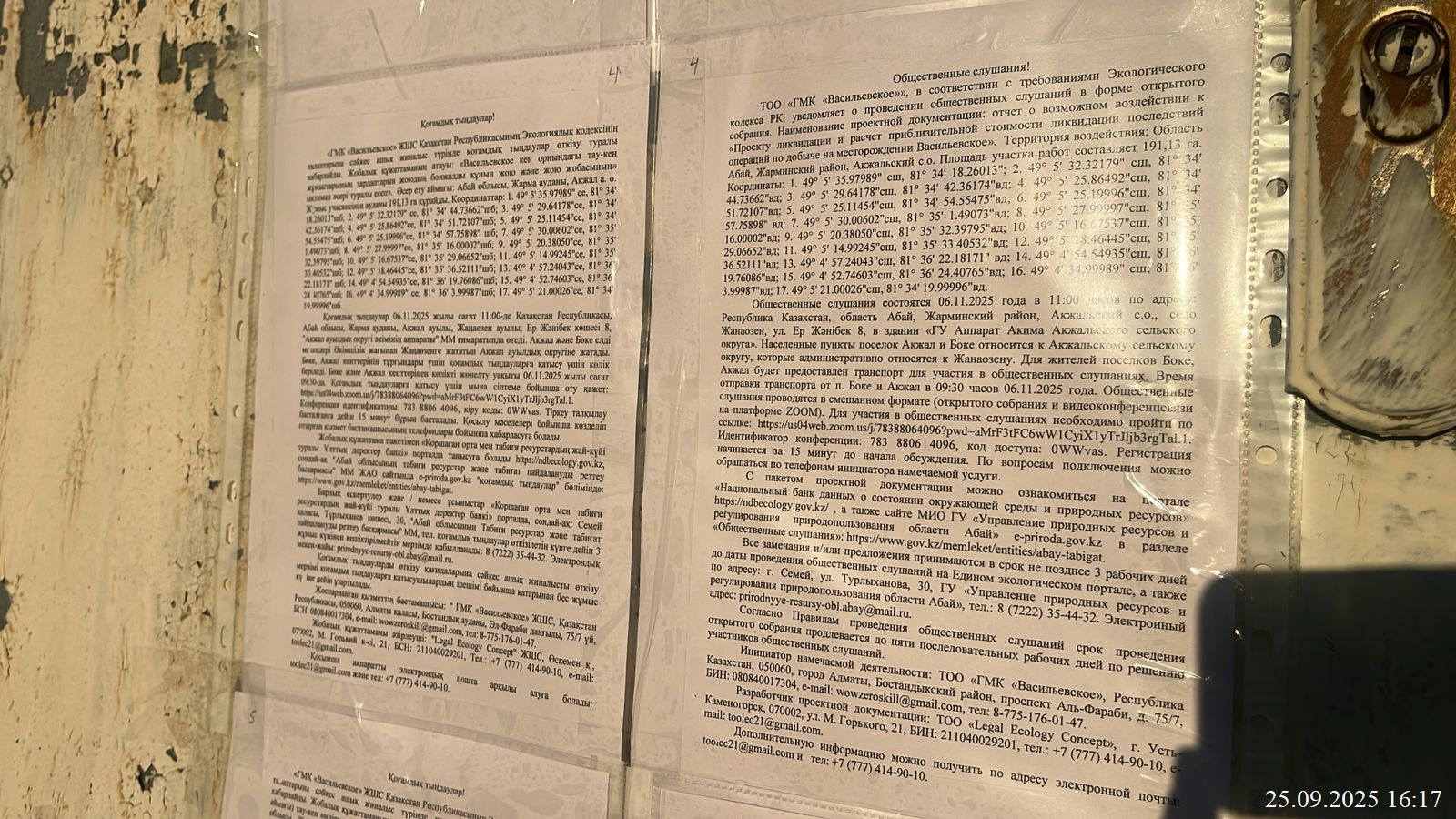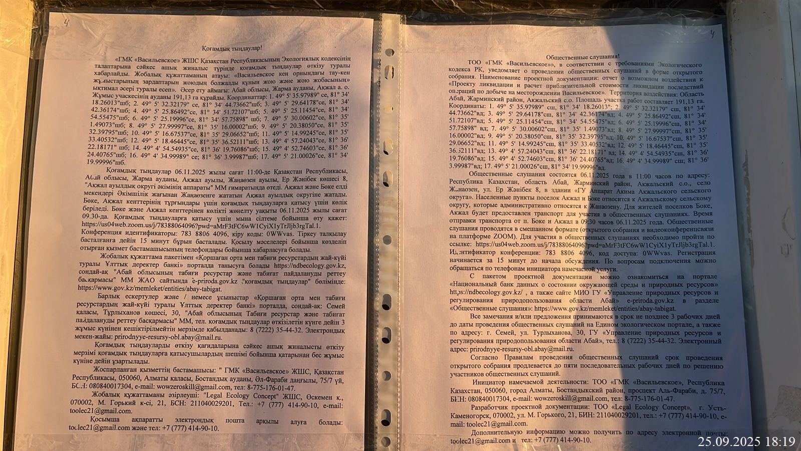3. Общественные слушания организованны: Главный специалист УПР и ПР область Абай, prirodnyye_resursy_obl.abay@mail.ru,