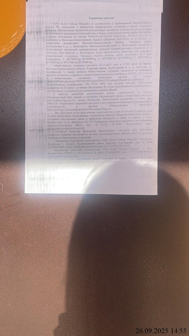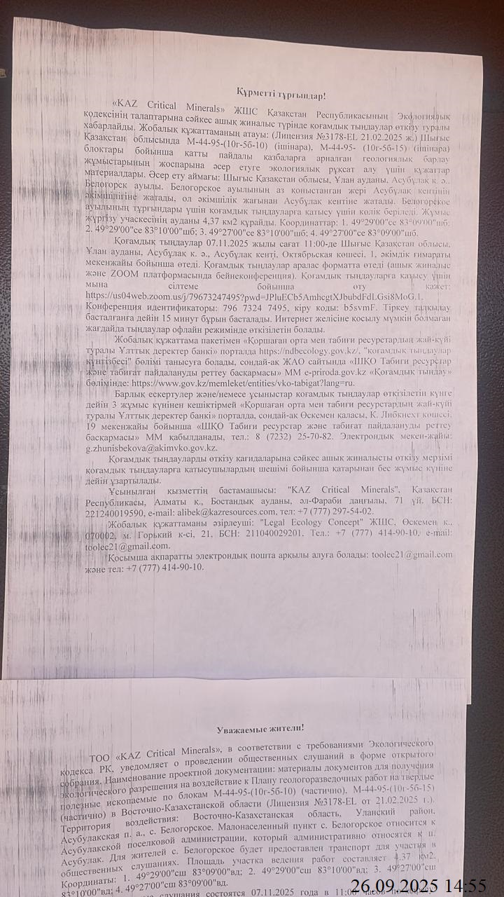 3. Общественные слушания организованны: Управление природных ресурсов и регулирования природопользования Восточно-Казахстанской области, g.zhunisbekova@akimvko.gov.kz,