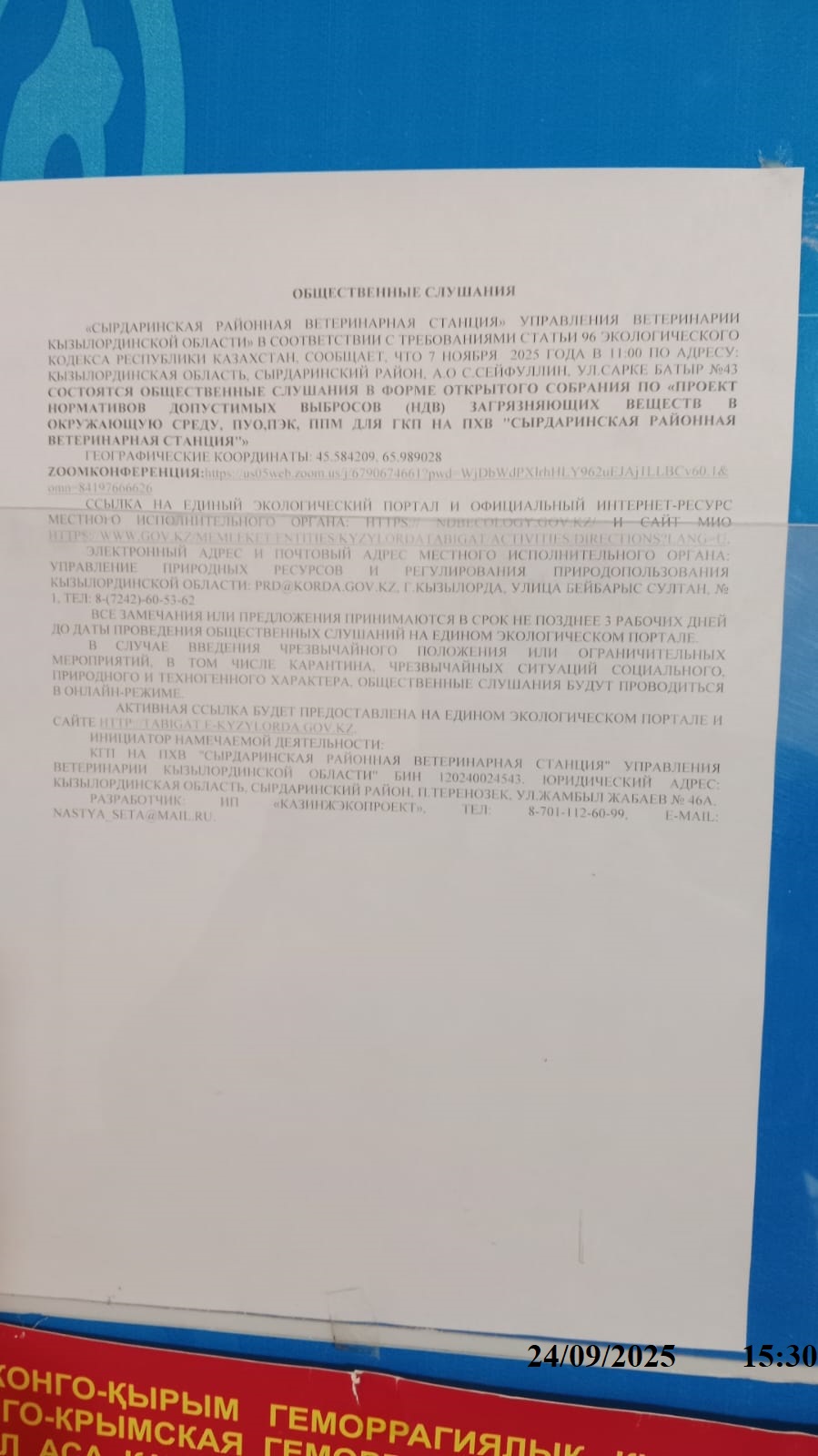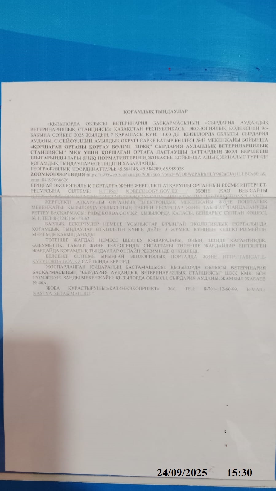 3. Общественные слушания организованны: Управление природных ресурсов и регулирования природопользования Кызылординской области, prd@korda.gov.kz 87242605362, 605369,