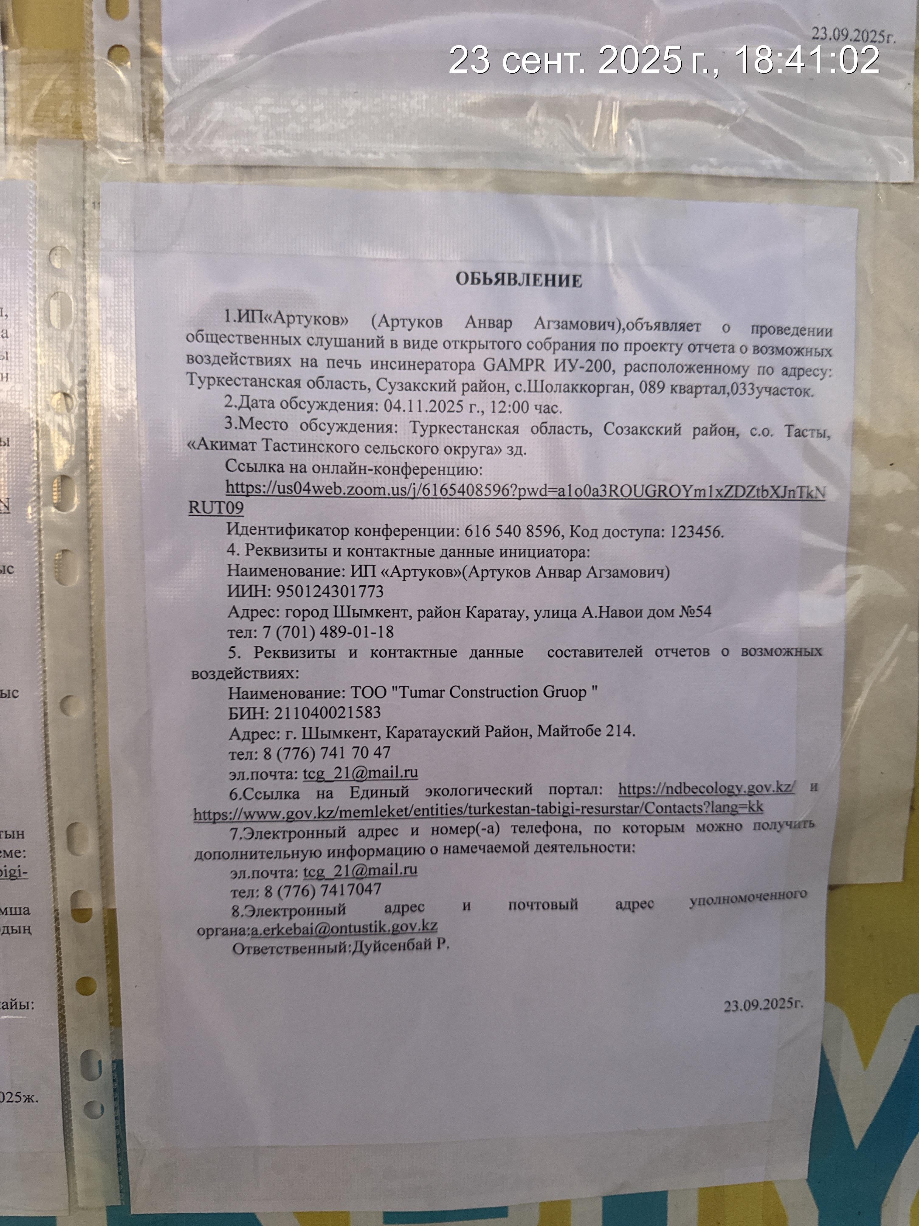 4. Повестка дня общественных слушаний: Эксплуатация инсинераторной печи предусматривается в арендуемого помещения по адресу. Общая площадь арендуемого помещения – 3,7 га. Кадастровый номер земельного участка №19-297-089-033. Целевое назначение земельного участка – пункт приема твердо бытовых отходов. Права на земельный участок – аренда, на основании дополнительное соглашение №1 к договору №4700017703 от 13 декабря 2022 года. (далее «Договор безвозмездного пользования земельным участок для целей утилизация отходов») г. Астана 14.07.2025 года. Рядом расположен ТОО «Казахстанско-французское совместное предприятие «КАТКО». Участок свободен от застроек и зеленых насаждений. Вблизи поверхностные водные объекты отсутствуют. Объект не входит в водоохранную зону. На территории участка и вблизи отсутствуют земли оздоровительного, рекреационного и историко-культурного назначения. Ближайшая жилая застройка расположена на расстоянии более 33,74 км. Координаты земельного участка:. Координаты земельного участка: 1 точка широта 44.247128° // долгота 68.926266° // 2 точка широта 44.245661° // долгота 68.928271° // 3 точка широта 44.244706° // долгота 68.926732° // 4 точка широта 44.246172° // долгота 68.924714° // ИП «Артуков» - предназначено для утилизации производственных и твердо бытовых отходов, которые образуется на производственной площадке ТОО «Казахстанско-французское совместное предприятие «КАТКО». Утилизация производственных и твердо бытовых отходов является исключение их вредного влияния на окружающую среду или снижение его до уровней, регламентированных государственными стандартами. ИП «Артуков» утилизирует отходов с помощью установленного печи инсинератора по адресу Туркестанская область, Сузакский район, Шолаккорганский с.о, Шолаккорган с., квартал 089, участок 033. Мощность установленного в участке печи инсинератора GAMPR ИУ-200 по сжиганию отходов 100 кг/час. Годовой объем утилизации путем сжигания отходов составляет – 876 тонн/год. Режим работы печи инсинератора – 24 час/сут, 8760 час/год. Утилизация отходов в объеме 100 кг/час, 2400 кг/сут, при времени работы 24 час*365 сут = 8760 час/год годовой объем сжигаемых отходов составляет 876 тонн, зола от сжигания отходов 43,8 т/год. Годовой объем сжигания отходов – 876 т/год. Режим работы предприятия – круглогодичный (365 сут/год). Количество работающего персонала 6 человек.