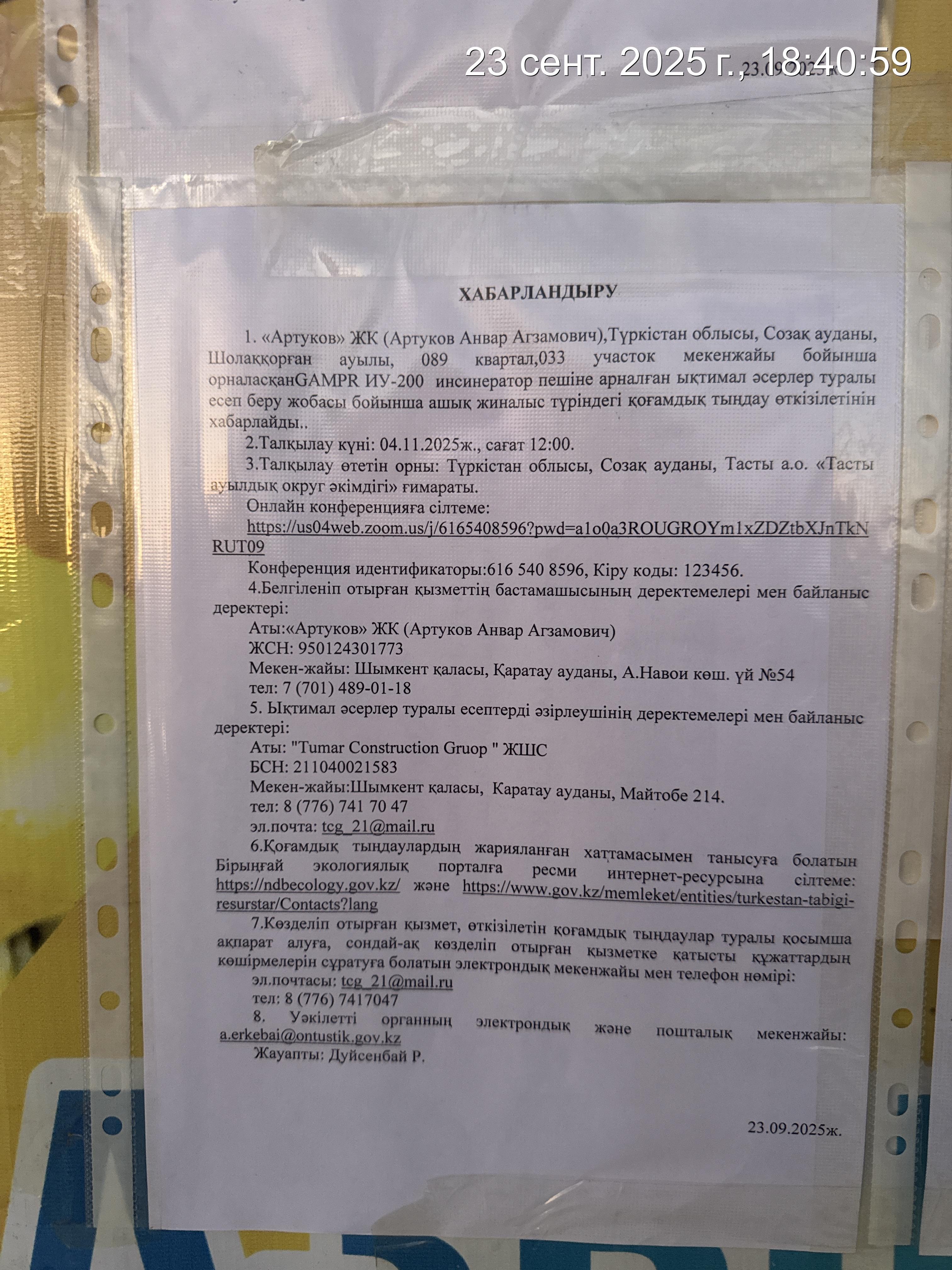3. Общественные слушания организованны: Управление природных ресурсов и регулирования природопользования Туркестанской области, a.erkebai@ontustik.gov.kz,