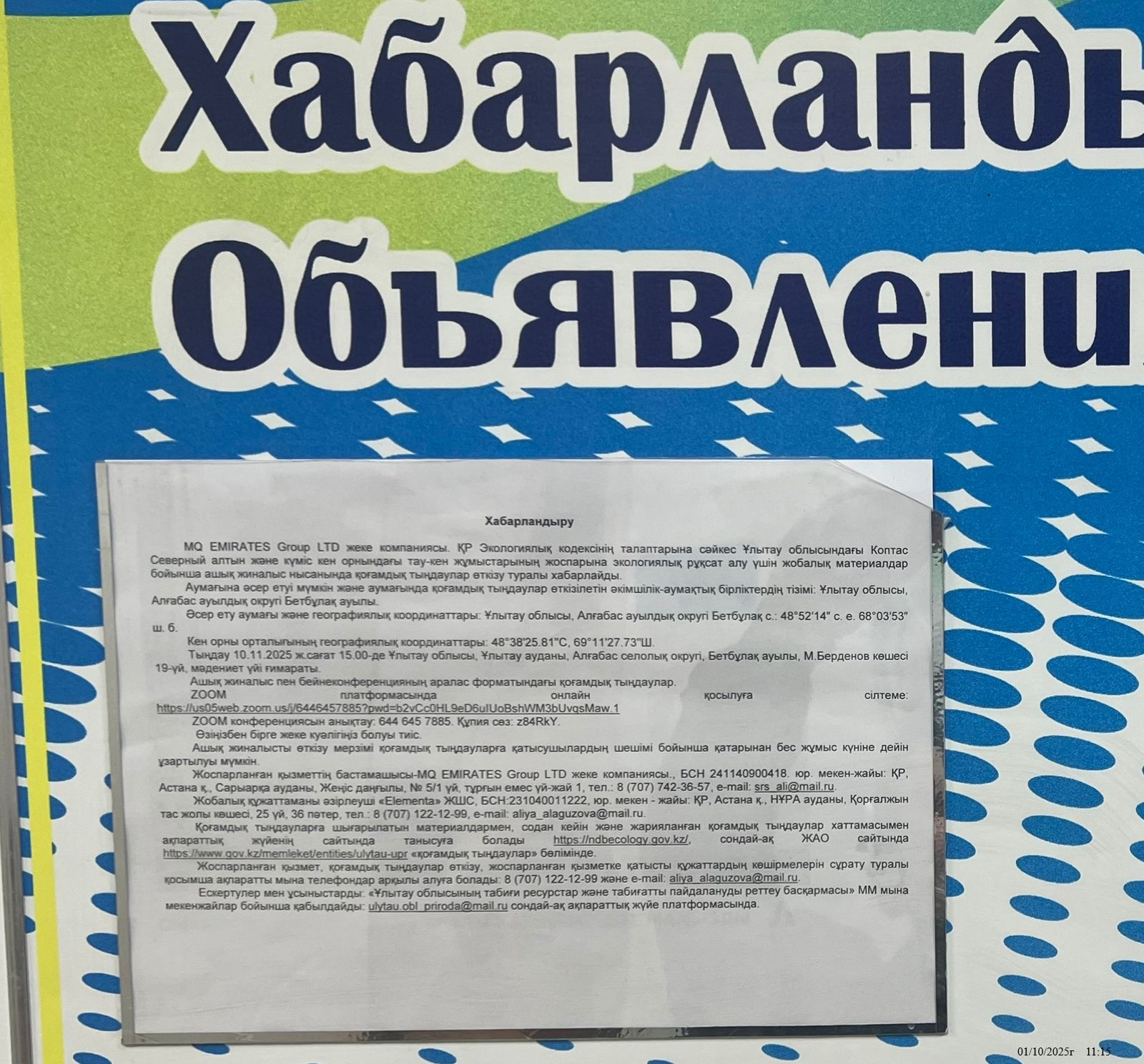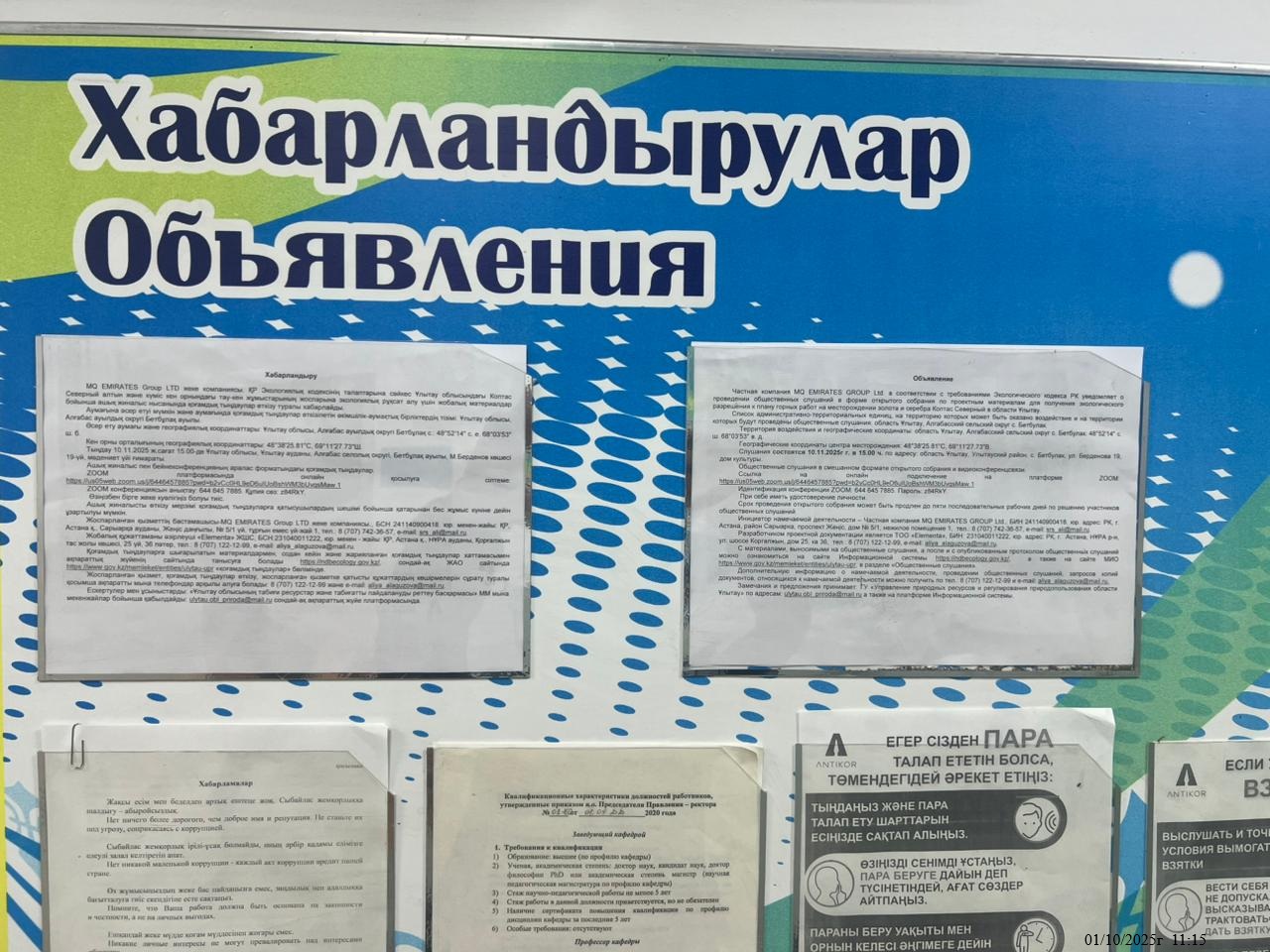 1.4. Описание для подключения к онлайн трансляции при прохождении общественного слушания: в соответствии с пп.4, п.11 прил. 3 Правил, информация о проведении общественных слушаний должна быть распространена на государственном и русском языках на досках объявлений местных исполнительных органов административно-территориальных единиц и в местах, специально предназначенных для размещения объявлений. В связи с чем необходимо дополнительно разместить печатные объявления на досках объявлений в акимате и в местах, специально предназначенных для размещения объявлений.