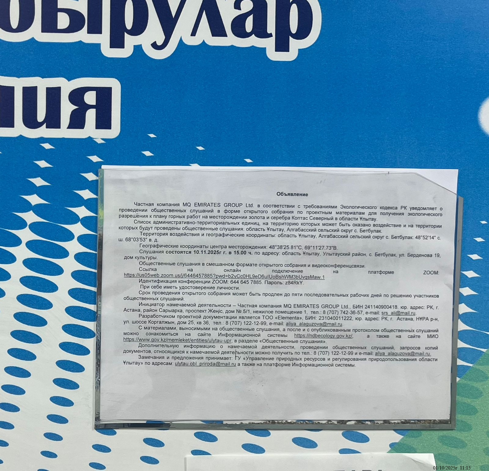 3. Общественные слушания организованны: Главный специалист УПР и ПР область Ұлытау, ulytau.obl_priroda@mail.ru,