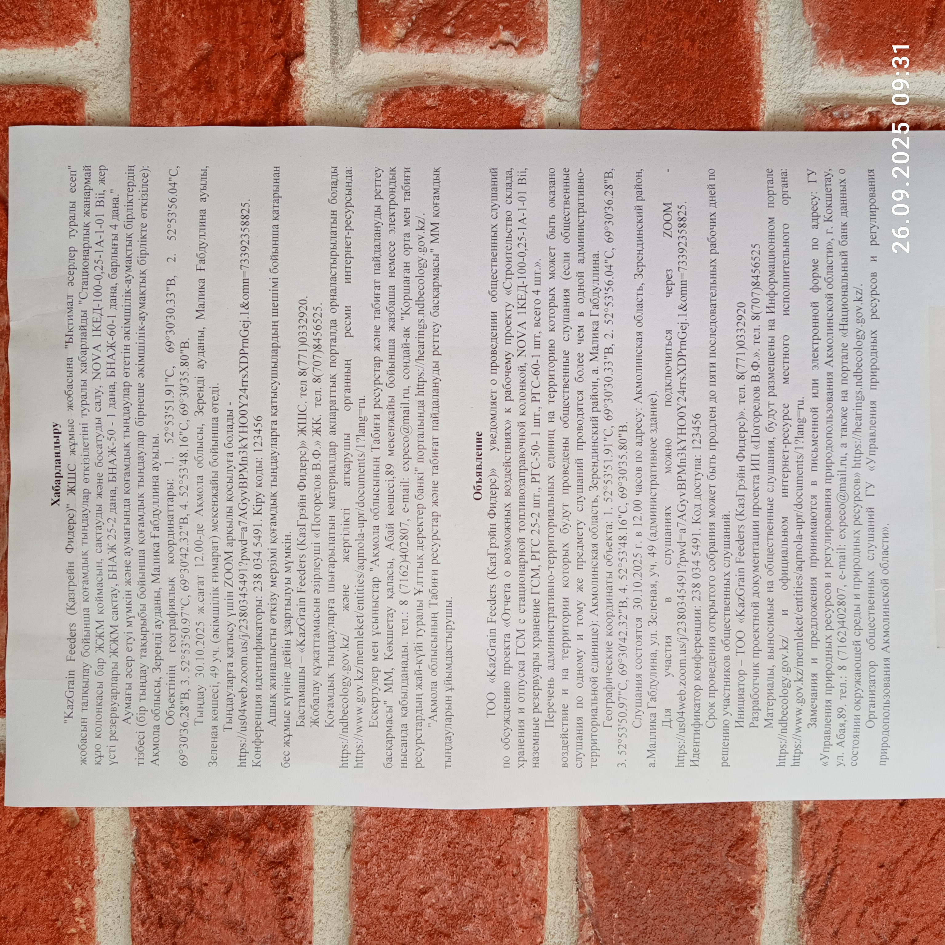 1.2. Место проведения: Акмолинская область, Зерендинский район, а.о.Малика Габдуллина, а.Малика Габдуллина, ул. Зеленая, уч. 49 (административное здание).Для участия в слушаниях можно подключиться через ZOOM - https://us04web.zoom.us/j/2380345491?pwd=a7AGyvBPMn3kYHO0Y24rrsXDPrnGej.1&omn=73392358825. Идентификатор конференции: 238 034 5491. Код доступа: 123456