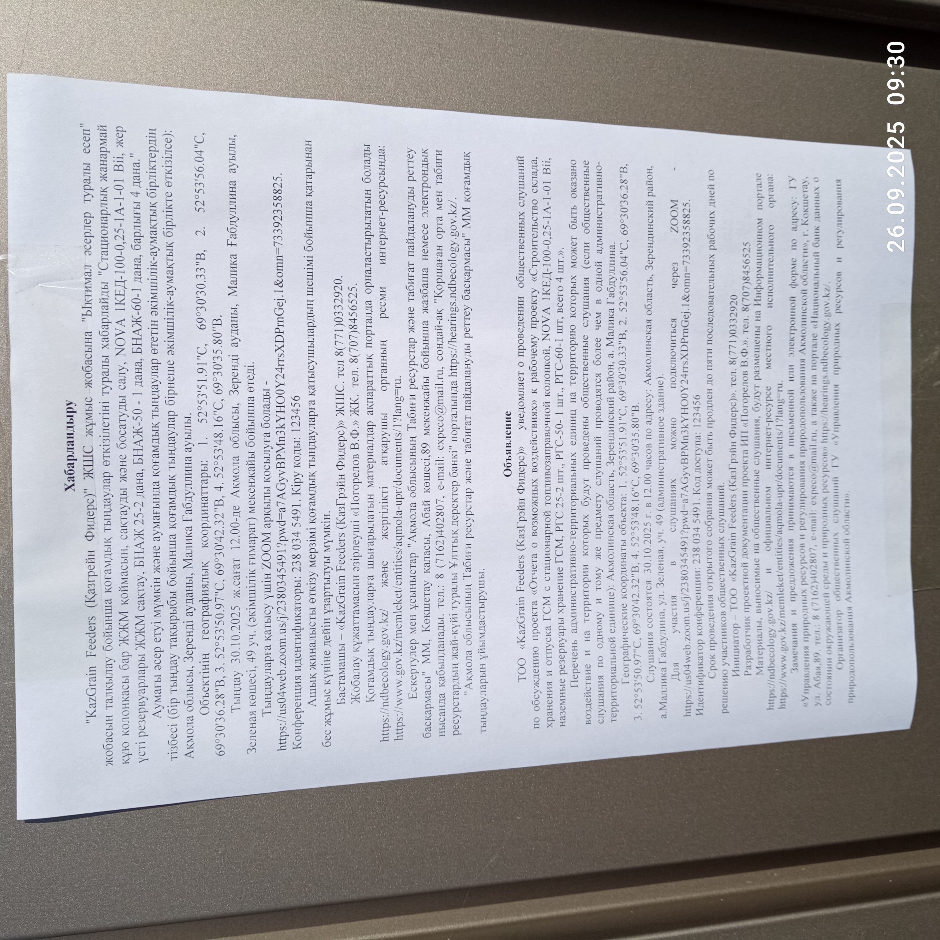 3. Общественные слушания организованны: Управление природных ресурсов и регулирования природопользования Акмолинской области, expeco@mail.ru,