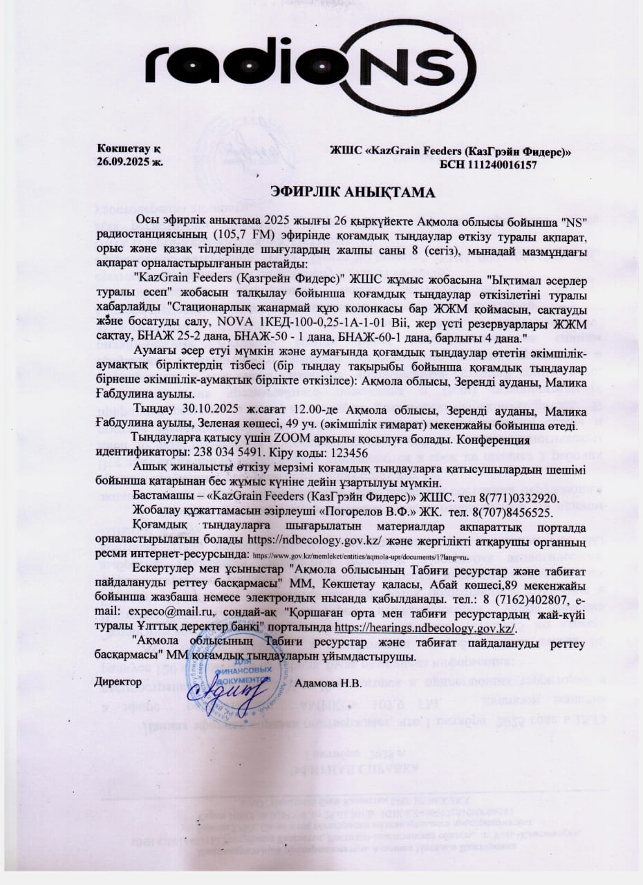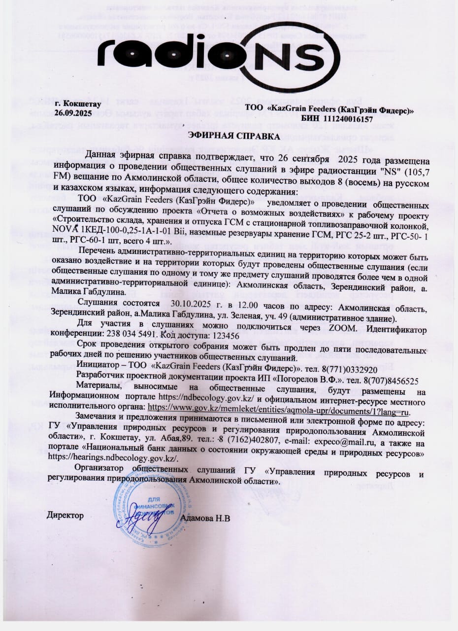 4. Повестка дня общественных слушаний: ТОО KazGrain Feeders (КазГрэйн Фидерс) является действующим предприятием и расположен в Акмолинской области, Зерендинский район, с. Малика Габдулина, ул. Зеленая, уч. 49. Ближайшая жилая зона находится на расстоянии 330 метров в северо-западном направлении от проектируемого объекта (склада ГСМ). Географические координаты объекта: 1. 52°53'51.91"С, 69°30'30.33"В, 2. 52°53'56.04"С, 69°30'36.28"В, 3. 52°53'50.97"С, 69°30'42.32"В, 4. 52°53'48.16"С, 69°30'35.80"В. Расположение склада ГСМ осуществляется на существующей территории предприятия. Согласно задание на проектирования и другого выбора мест расположения не предусматривается. Проектом предусмотрено размещение парка хранения ГСМ для собственных нужд: парк хранения № 1 - РГС для диз. топлива V=60 м³, РГС для диз. топлива V=50 м³, 2 ёмкости V=25 м³ каждый, РГС под диз. топлива и установка топливораздаточного колонки для заправки трансопорта. Прокладка отпускного трубопровода наземная из стальных труб, прокладывается на высоте Н=0,5 м. Прокладка приемного трубопровода наземная из стальных труб ∅100 мм, на опорах. Высота опор 4 м. Шаг опор 4м. Для регулирования и отключения подачи гсм потребителям на характерных участках топливопровода устанавливаются отключающие устройства - краны шаровые фланцевые. На подводке к оборудованию предусмотрена установка отключающих устройств типа КШЦ.Ф с уплотнением рабочей части типа ALSO.