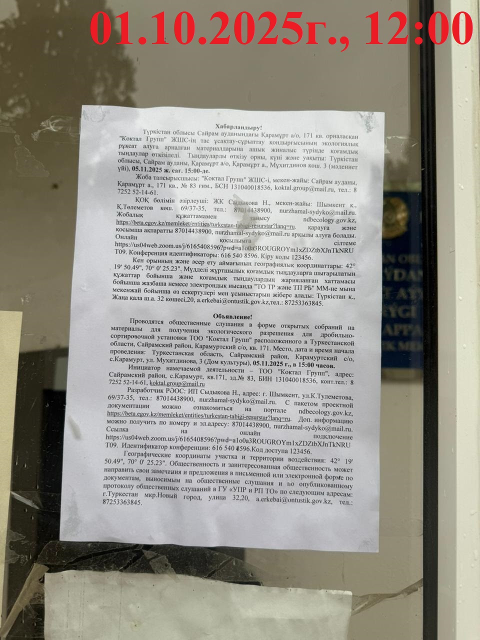 По проекту: Материалы для получения экологического разрешения для дробильно-сортировочной установки ТОО "Коктал Групп" расположенного в Туркестанской области, Сайрамский район, Карамуртский с/о, кв. 171.