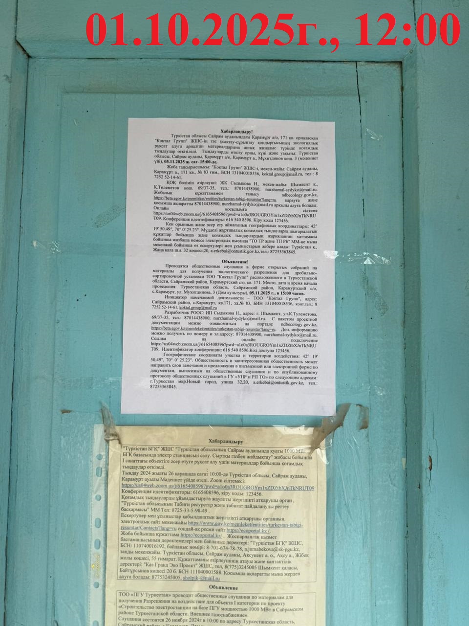 3. Общественные слушания организованны: Управление природных ресурсов и регулирования природопользования Туркестанской области, a.erkebai@ontustik.gov.kz,