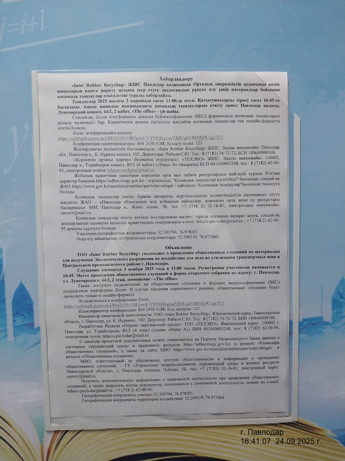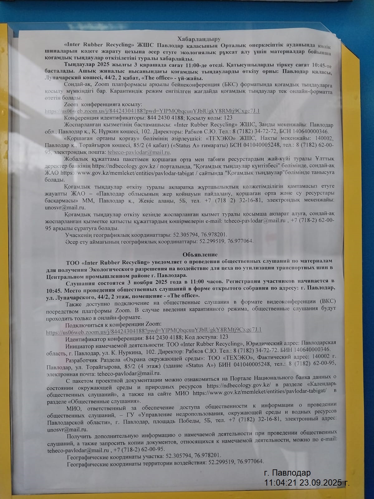 4. Повестка дня общественных слушаний: Производственный объект является существующим и действующим с 2014 года. Оценка воздействия на окружающую среду была проведена и получено Заключение государственной экологической экспертизы KZ95VDC00044339 от 21.12.2015 г., Разрешение на эмиссии в окружающую среду для объектов I, II и III категорий KZ51VDD00052325 от 04.04.2016 г. и Решение по определению категории объекта, оказывающего негативное воздействие на окружающую среду от 10.09.2021 г. Изменений в виды деятельности объекта не будет. Деятельность будет продолжаться без изменения технологии производства, на ранее установленном оборудовании. Устанавливаются нормативы допустимых выбросов (НДВ) загрязняющих веществ, для цеха по утилизации транспортных шин ТОО «Inter Rubber Recycling» на период 2026-2035 гг. При проведении обследования на территории предприятия всего выявлено три источника выбросов, из которых два - организованных и один – неорганизованный. Основной вид деятельности предприятия – переработка и утилизация транспортных шин. Ближайшие жилые дома находятся на расстоянии 680 метров в южном направлении от территории предприятия. Численность рабочего и обслуживающего персонала составляет 11 человек. Режим производства работ: 5 дней в неделю, 8 ч/день. Площадка предприятия относится ко II категории, как объекты, на которых осуществляются операции по удалению неопасных отходов, с производительностью, не превышающей 50 тонн в сутки, согласно пп. 6.6 п. 6 Раздела 2 Приложения 2 к Экологическому Кодексу РК от 02.01.2021 г.