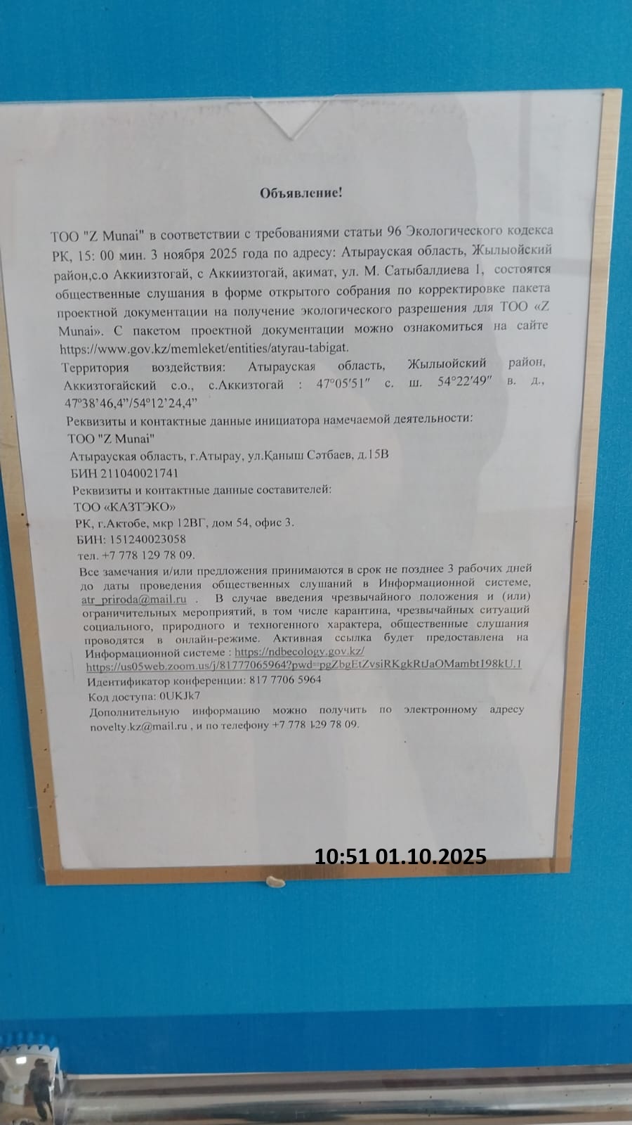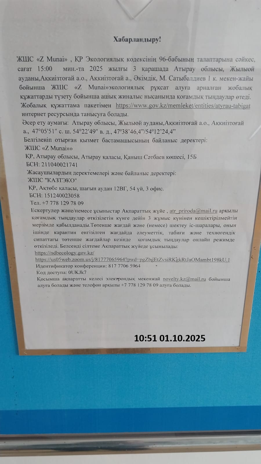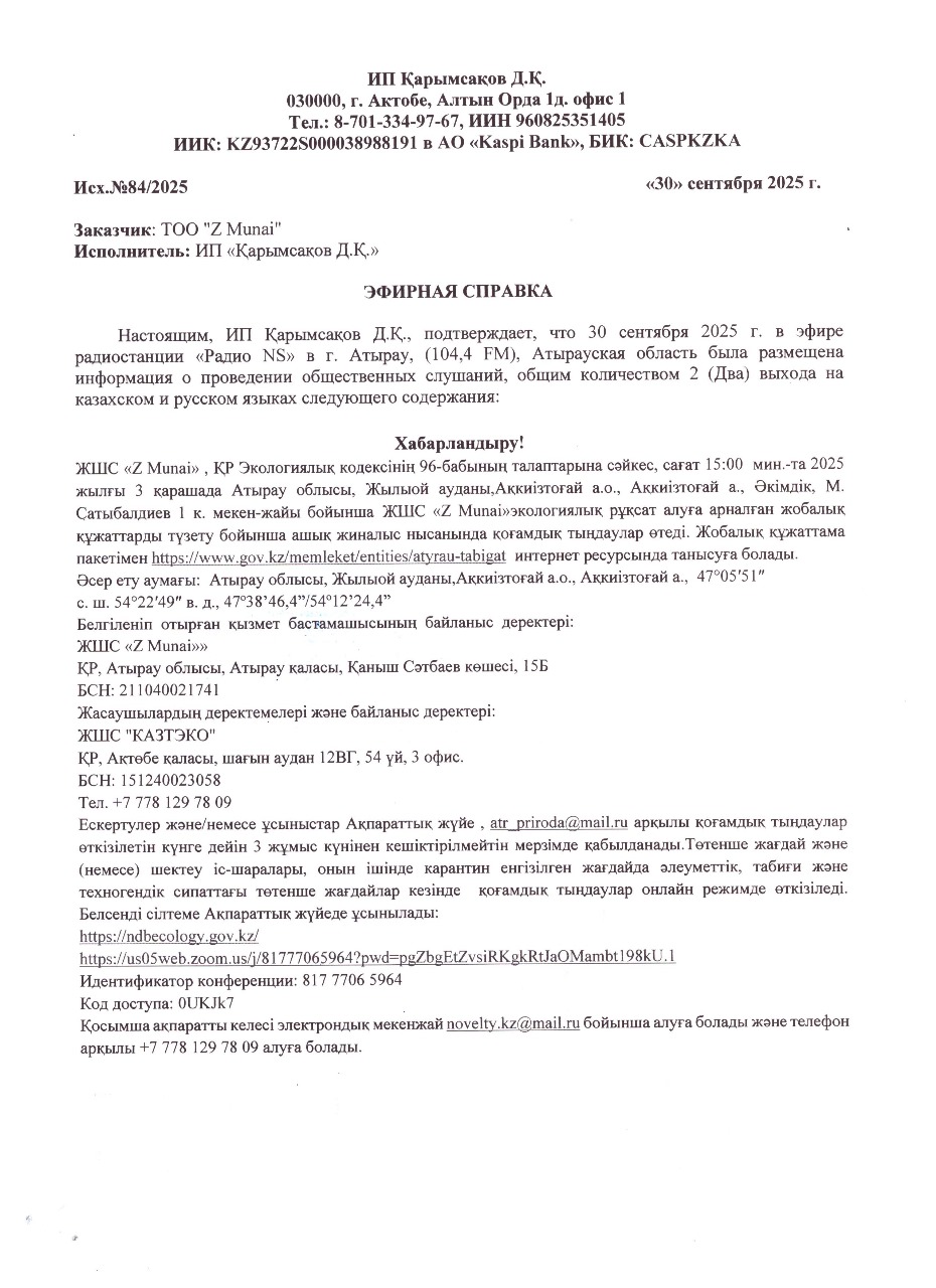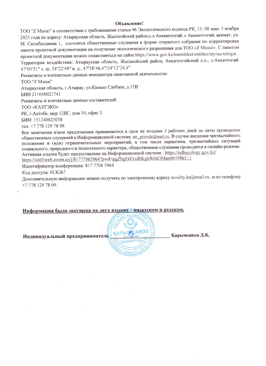 4. Повестка дня общественных слушаний: Хабарландыру! ЖШС «Z Munai» , ҚР Экологиялық кодексінің 96-бабының талаптарына сәйкес, сағат 15:00 мин.-та 2025 жылғы 3 қарашада Атырау облысы, Жылыой ауданы,Ақкиізтоғай а.о., Ақкиізтоғай а., Әкімдік, М. Сатыбалдиев 1 к. мекен-жайы бойынша, ЖШС «Z Munai» экологиялық рұқсат алуға арналған жобалық құжаттарды түзету бойынша ашық жиналыс нысанында қоғамдық тыңдаулар өтеді. Жобалық құжаттама пакетімен https://www.gov.kz/memleket/entities/atyrau-tabigat интернет ресурсында танысуға болады. Әсер ету аумағы: Атырау облысы, Жылыой ауданы,Ақкиізтоғай а.о., Ақкиізтоғай а., 47°05′51″ с. ш. 54°22′49″ в. д., 47º38’46,4”/54º12’24,4” Белгіленіп отырған қызмет бастамашысының байланыс деректері: ЖШС «Z Munai»» ҚР, Атырау облысы, Атырау қаласы, Қаныш Сәтбаев көшесі, 15Б БCН: 211040021741 Жасаушылардың деректемелері және байланыс деректері: ЖШС "КАЗТЭКО" ҚР, Ақтөбе қаласы, шағын аудан 12ВГ, 54 үй, 3 офис. БCН: 151240023058 Тел. +7 778 129 78 09 Ескертулер және/немесе ұсыныстар Ақпараттық жүйе , atr_priroda@mail.ru арқылы қоғамдық тыңдаулар өткізілетін күнге дейін 3 жұмыс күнінен кешіктірілмейтін мерзімде қабылданады.Төтенше жағдай және (немесе) шектеу іс-шаралары, онын ішінде карантин енгізілген жағдайда әлеуметтік, табиғи және техногендік сипаттағы төтенше жағдайлар кезінде қоғамдық тыңдаулар онлайн режимде өткізіледі. Белсенді сілтеме Ақпараттық жүйеде ұсынылады: https://ndbecology.gov.kz/ https://us05web.zoom.us/j/81777065964?pwd=pgZbgEtZvsiRKgkRtJaOMambt198kU.1 Идентификатор конференции: 817 7706 5964 Код доступа: 0UKJk7 Қосымша ақпаратты келесі электрондық мекенжай novelty.kz@mail.ru бойынша алуға болады және телефон арқылы +7 778 129 78 09 алуға болады. Объявление! ТОО "Z Munai" в соответствии с требованиями статьи 96 Экологического кодекса РК, 15: 00 мин. 3 ноября 2025 года по адресу: Атырауская область, Жылыойский район,с.о Аккиизтогай, с Аккиизтогай, акимат, ул. М. Сатыбалдиева 1, состоятся общественные слушания в форме открытого собрания по корректировке пакета проектной документации на получение экологического разрешения для ТОО "Z Munai". С пакетом проектной документации можно ознакомиться на сайте https://www.gov.kz/memleket/entities/atyrau-tabigat Территория воздействия: Атырауская область, Жылыойский район, Аккизтогайский с.о., с.Аккизтогай : 47°05′51″ с. ш. 54°22′49″ в. д., 47º38’46,4”/54º12’24,4” Реквизиты и контактные данные инициатора намечаемой деятельности: ТОО "Z Munai" Атырауская область, г.Атырау, ул.Қаныш Сәтбаев, д.15В БИН 211040021741 Реквизиты и контактные данные составителей: ТОО «КАЗТЭКО» РК, г.Актобе, мкр 12ВГ, дом 54, офис 3. БИН: 151240023058 тел. +7 778 129 78 09. Все замечания и/или предложения принимаются в срок не позднее 3 рабочих дней до даты проведения общественных слушаний в Информационной системе, atr_priroda@mail.ru. В случае введения чрезвычайного положения и (или) ограничительных мероприятий, в том числе карантина, чрезвычайных ситуаций социального, природного и техногенного характера, общественные слушания проводятся в онлайн-режиме. Активная ссылка будет предоставлена на Информационной системе : https://ndbecology.gov.kz/ https://us05web.zoom.us/j/81777065964?pwd=pgZbgEtZvsiRKgkRtJaOMambt198kU.1 Идентификатор конференции: 817 7706 5964 Код доступа: 0UKJk7 Дополнительную информацию можно получить по электронному адресу novelty.kz@mail.ru , и по телефону +7 778 129 78 09.