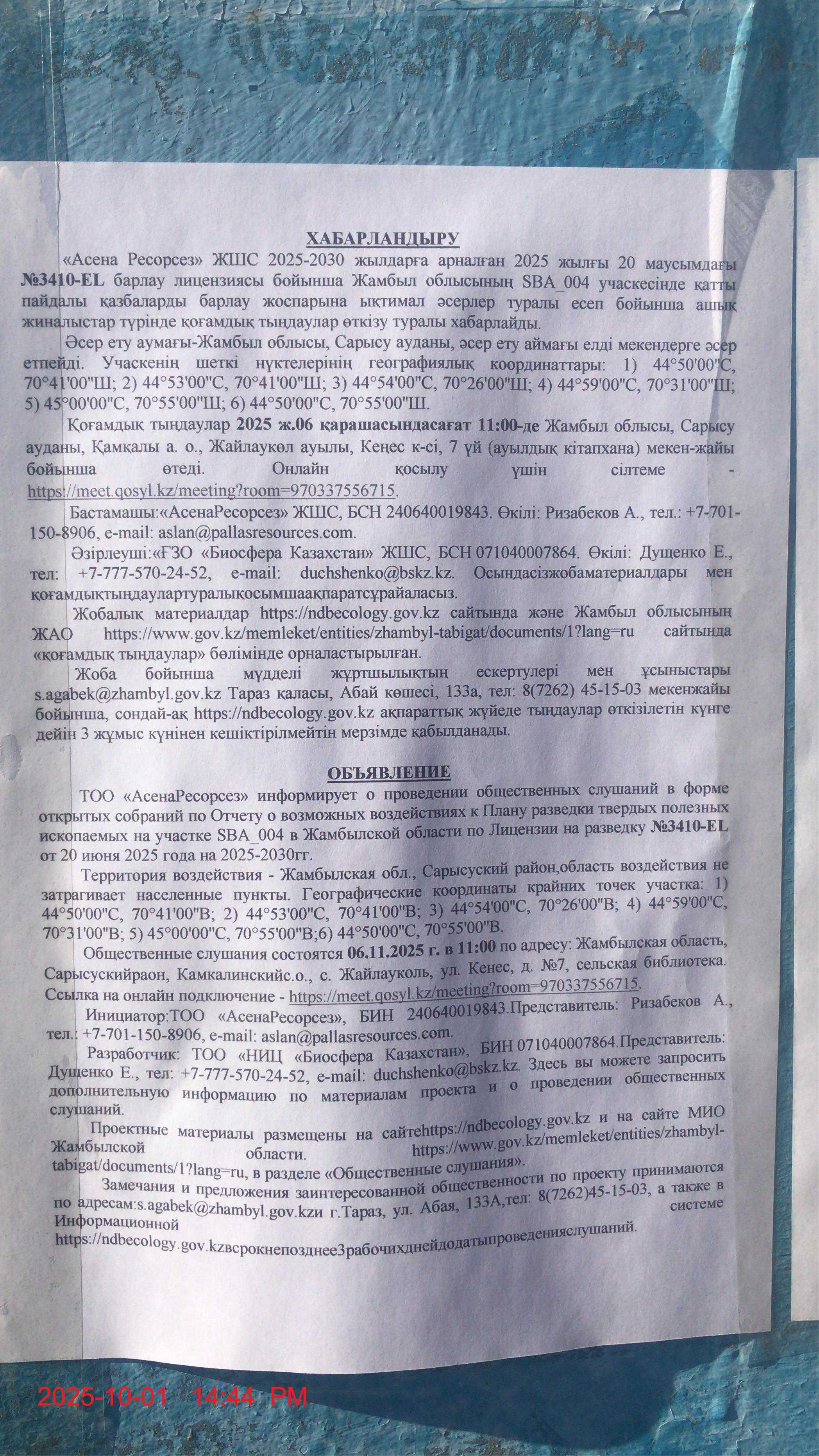 1.4. Описание для подключения к онлайн трансляции при прохождении общественного слушания: Приглашение на запланированную встречу в Qosyl Тема встречи: ""Асена Ресорсез"" жауапкершілігі шектеулі серіктестігі Время встречи: 06.11.2025 11:00 Длительность встречи: 01 час. Идентификатор встречи: 970-337-556-715 Подключиться к встрече в Qosyl: https://meet.qosyl.kz/meeting?room=970337556715