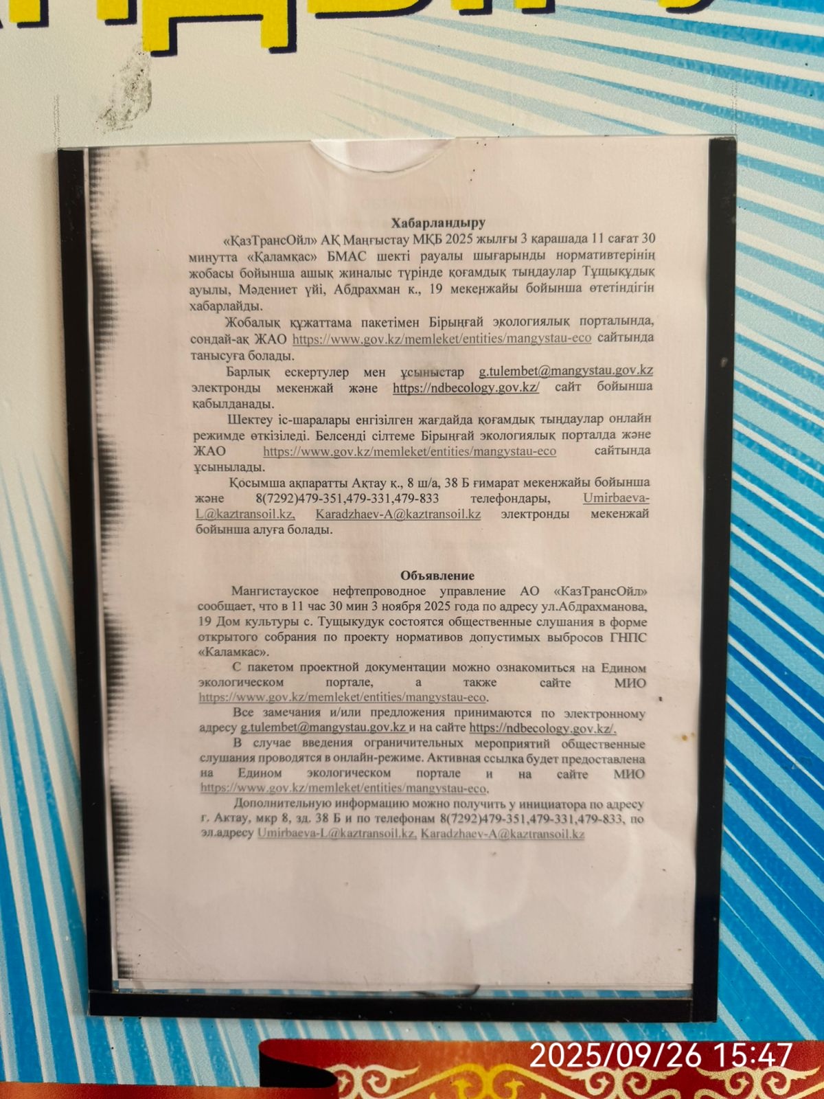 3. Общественные слушания организованны: Управление природных ресурсов и регулирования природопользования Мангистауской области, s.bazarbay@mangystau.gov.kz,