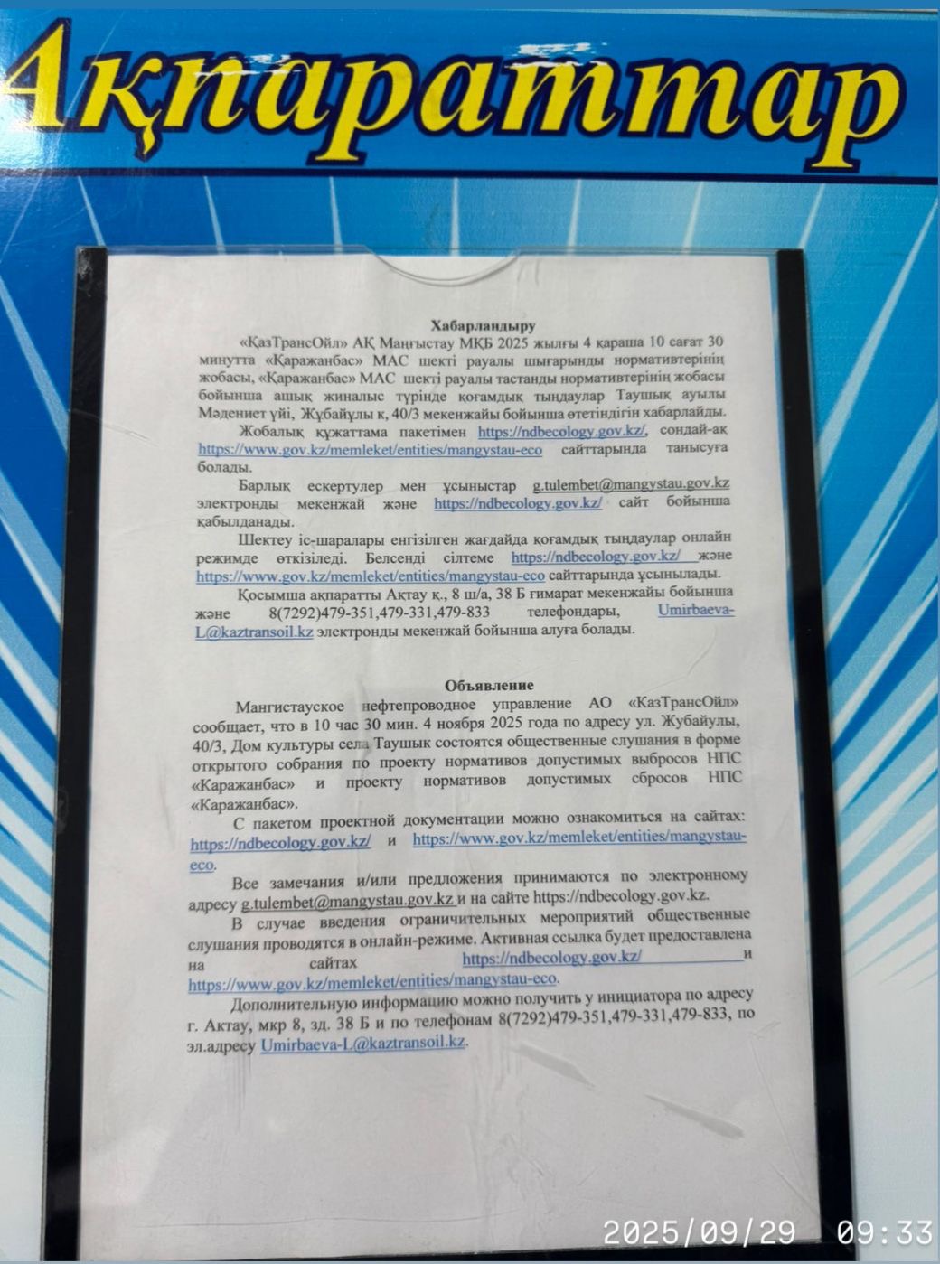 3. Общественные слушания организованны: Управление природных ресурсов и регулирования природопользования Мангистауской области, s.bazarbay@mangystau.gov.kz,