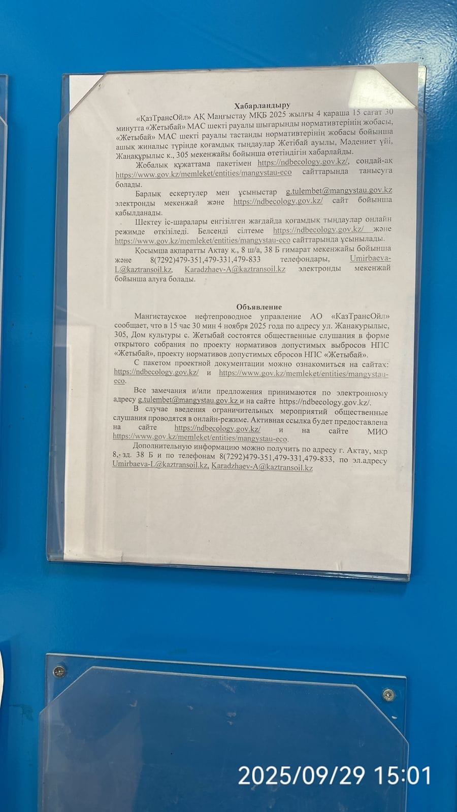 3. Общественные слушания организованны: Управление природных ресурсов и регулирования природопользования Мангистауской области, s.bazarbay@mangystau.gov.kz,