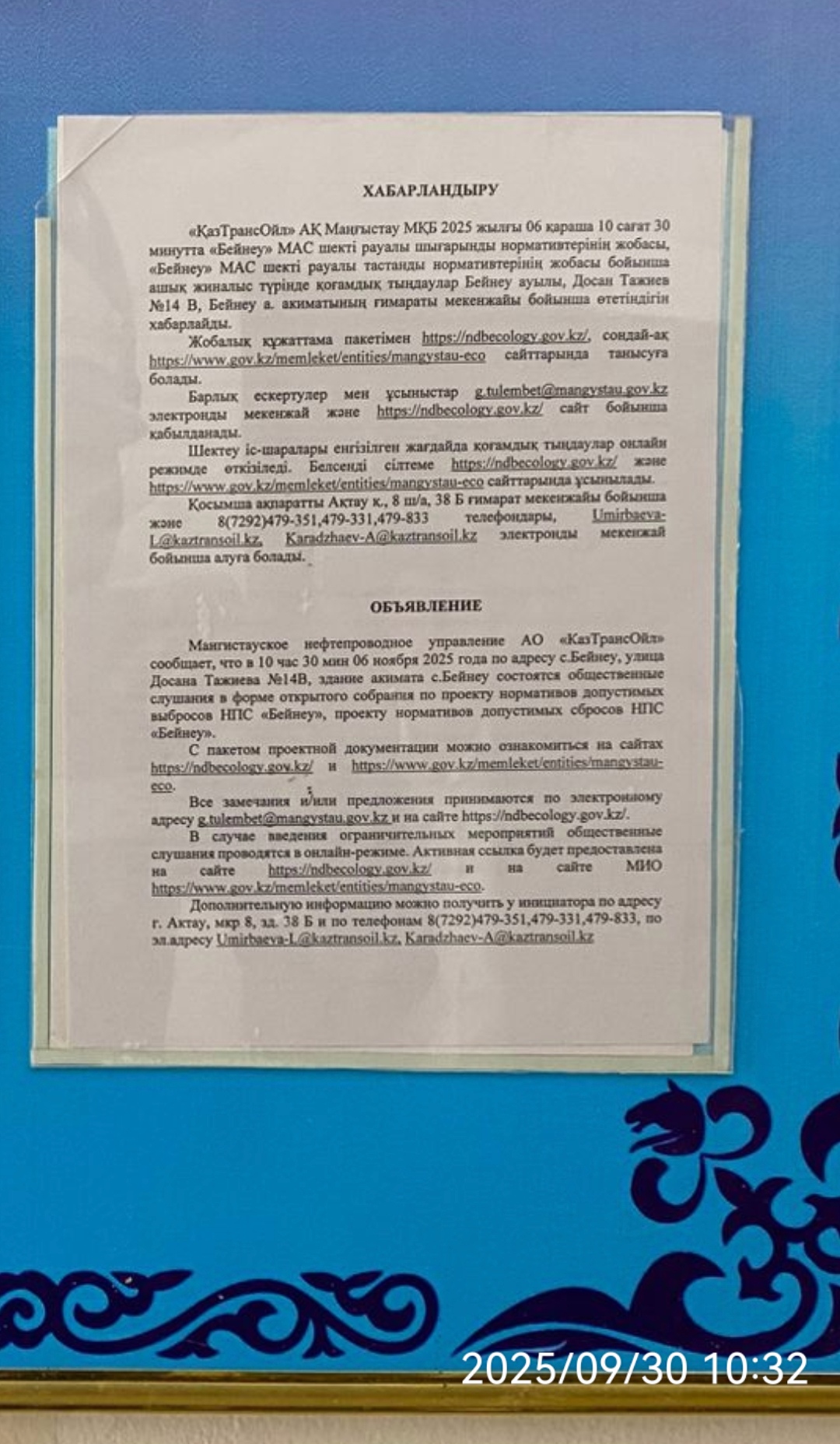 3. Общественные слушания организованны: Управление природных ресурсов и регулирования природопользования Мангистауской области, s.bazarbay@mangystau.gov.kz,