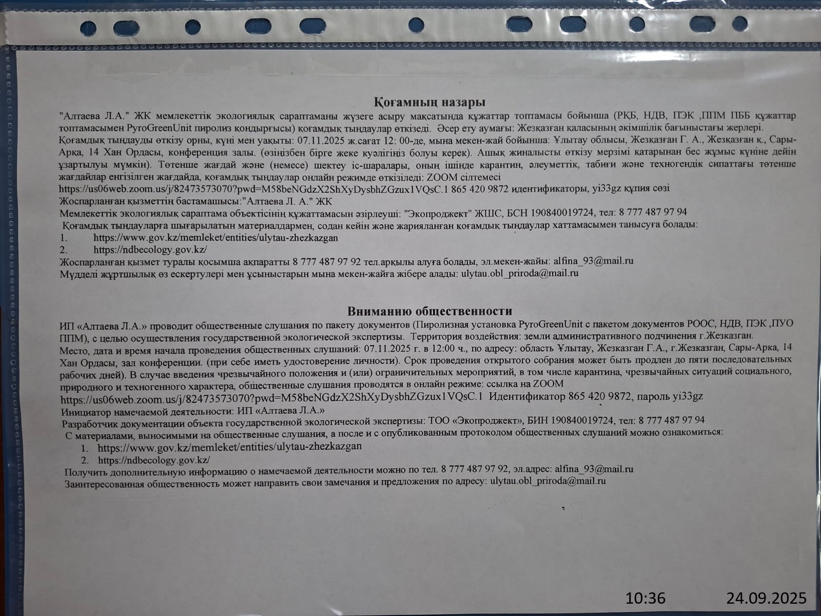 3. Общественные слушания организованны: Главный специалист УПР и ПР область Ұлытау, ulytau.obl_priroda@mail.ru,