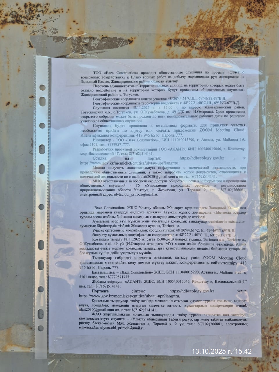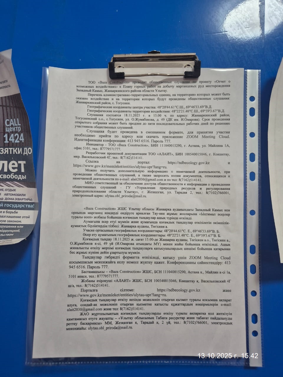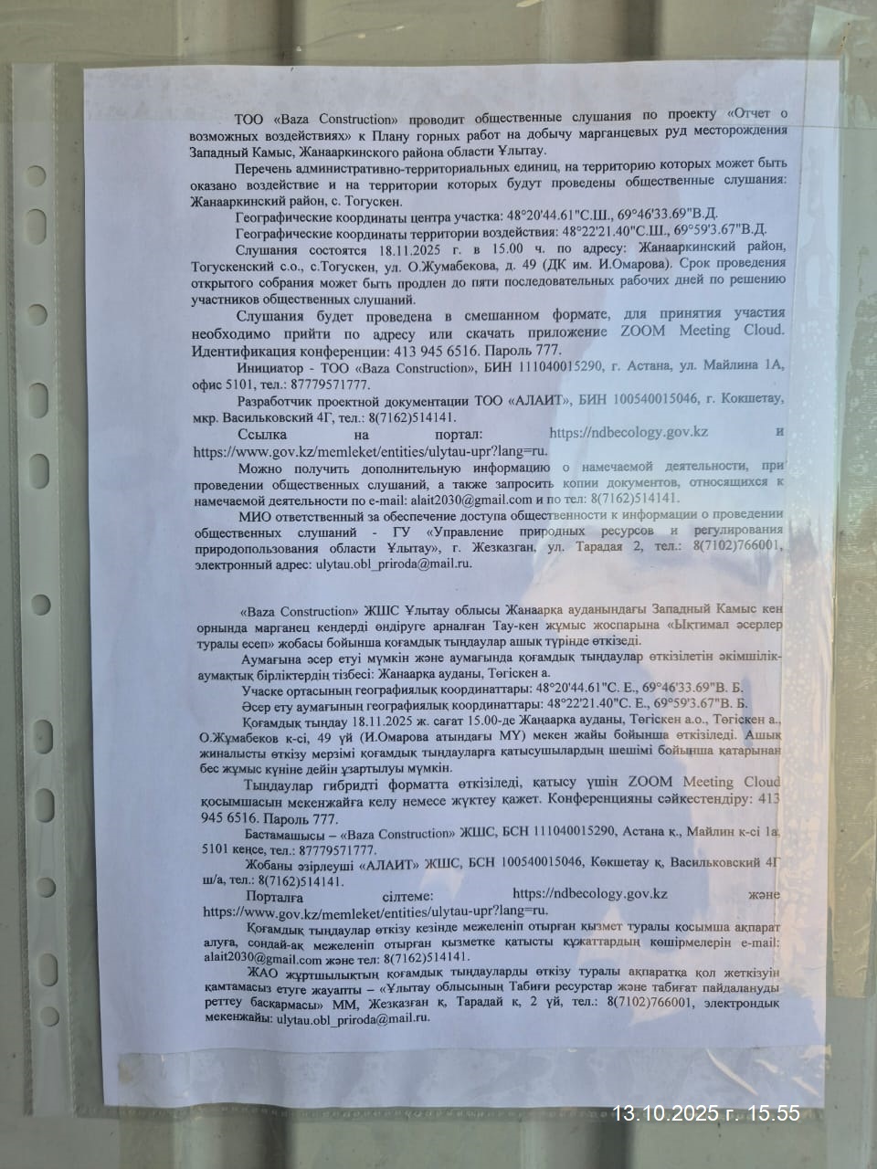 4. Повестка дня общественных слушаний: План горных работ на добычу марганцевых руд месторождения Западный Камыс, Жанааркинского района области Ұлытау (далее План горных работ) выполнен по заданию ТОО «Baza Construction». ТОО «Baza Construction» является победителем аукциона, проведенного 29 января 2025 года по лоту № 402599 (месторождение Западный Камыс). 28 февраля 2025 года за исх.№01-07-15/1164 ТОО «Baza Construction» получено уведомление Министерства промышленности и строительства развития Республики Казахстан о необходимости согласования и проведения экспертиз плана горных работ и плана ликвидации в соответствии со статьями 216 и 217 Кодекса РК «О недрах и недропользовании». План горных работ предусматривает промышленную добычу мар-ганцевых руд открытым способом с запасами, утвержденными Протоко-лом ГКЗ РК №1273 от 15 августа 2011 г. области Ұлытау. Непосредственно возле месторождениz проходит шоссейная дорога, а в 2 км южнее - железная дорога, связывающая города Караганда - Жез-казган. Районный центр - поселок Атасу (с железнодорожной станцией Жана-Арка) удален от участка работ на 160 км к северо-востоку, город Жезказган находится в 170 км к юго-западу и город Караганда - в 360 км к северо-востоку. Объект распологается на землях с.о. Тогускен Жанааркинского района области Ұлытау.
