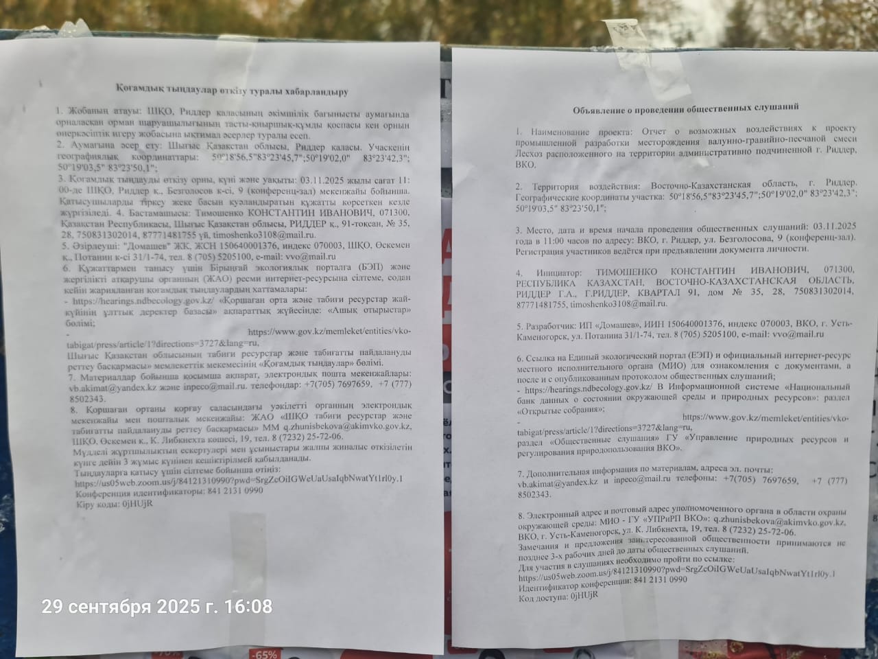 4. Повестка дня общественных слушаний: В административном отношении участок осуществления намечаемой деятельности расположен в ВКО, г. Риддер, на территории земельного участка с кадастровым номером - 05-083-038-340.Годовая производительность карьера по добыче валунно-гравийно-песчаной смеси составит от 15 до 75 тыс. м3 в год. Эксплуатация предусмотрена в течение 10 лет.Месторождение валунно-гравийно-песчаной смеси Лесхоз будет разрабатываться открытым способом. В соответствии с горно-геологическими условиями залегания полезного ископаемого в проекте принимается продольная однобортовая система разработки. Учитывая небольшую производительность карьера и небольшое расстояние транспортировки сырья до дробильно-сортировочного завода, разработка будет производиться с применением экскаваторно-автотранспортной системы. Так как объём вскрышных работ относительно небольшой, принимается совмещенная схема производства вскрышных и добычных работ. Разработка месторождения включает следующие основные операции: 1.Разработка, погрузка и транспортировка на внутренний отвал вскрышных пород; 2. Выемка полезного ископаемого экскаватором драглайном во временный отвал; 3. Погрузка полезного ископаемого экскаватором в автосамосвалы; 4. Транспортирование сырья на сортировочно-дробильный завод; Тема: Общественные слушания Время: 3 нояб. 2025 11:00 AM Астана, Алматы Подключиться к конференции Zoom https://us05web.zoom.us/j/84121310990?pwd=SrgZcOiIGWeUaUsaIqbNwatYt1rl0y.1 Идентификатор конференции: 841 2131 0990 Код доступа: 0jHUjR