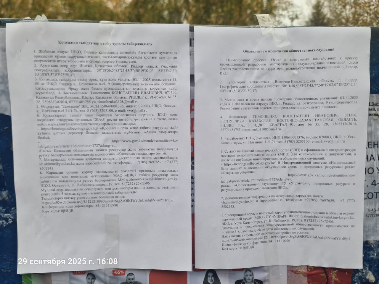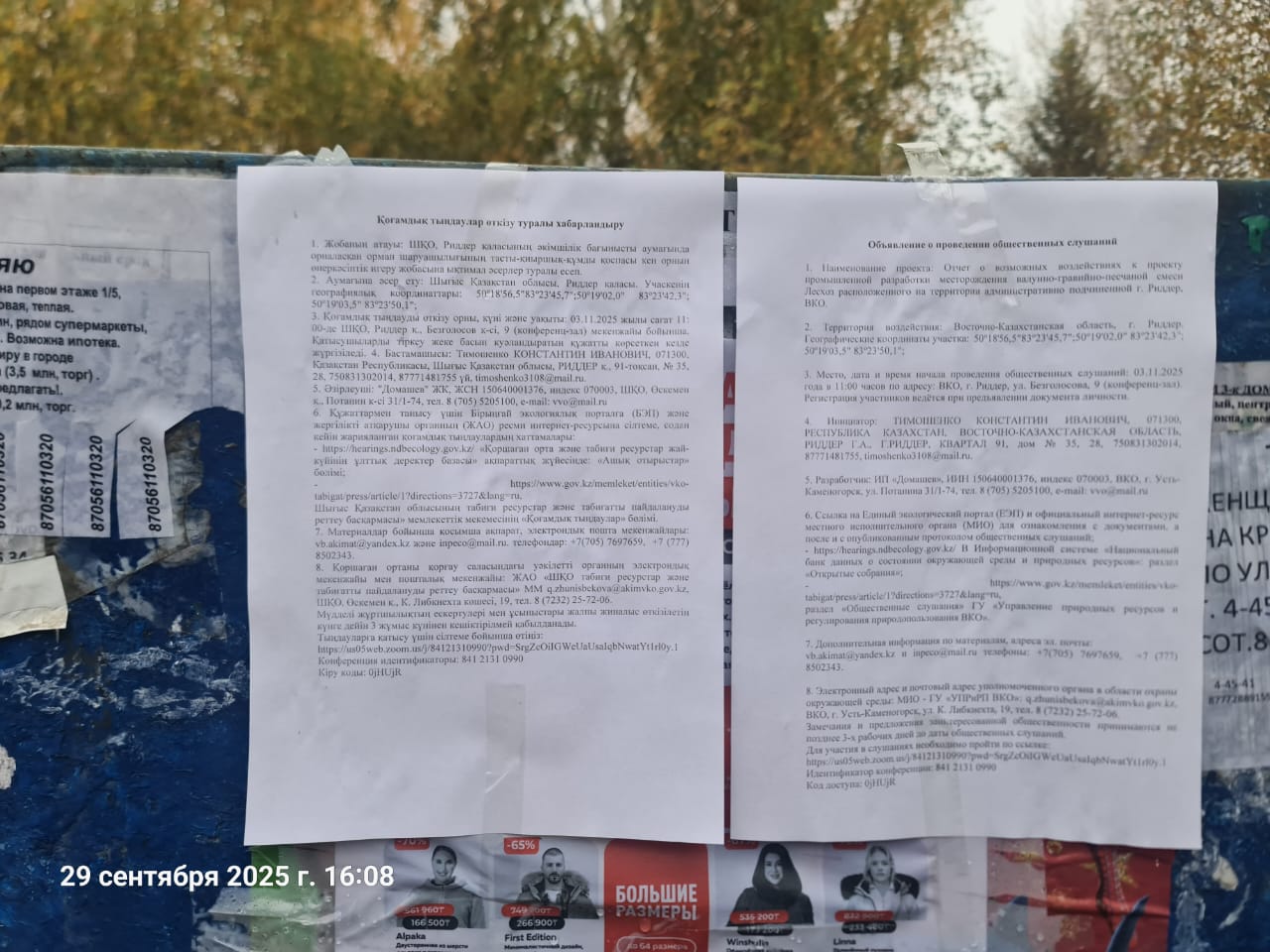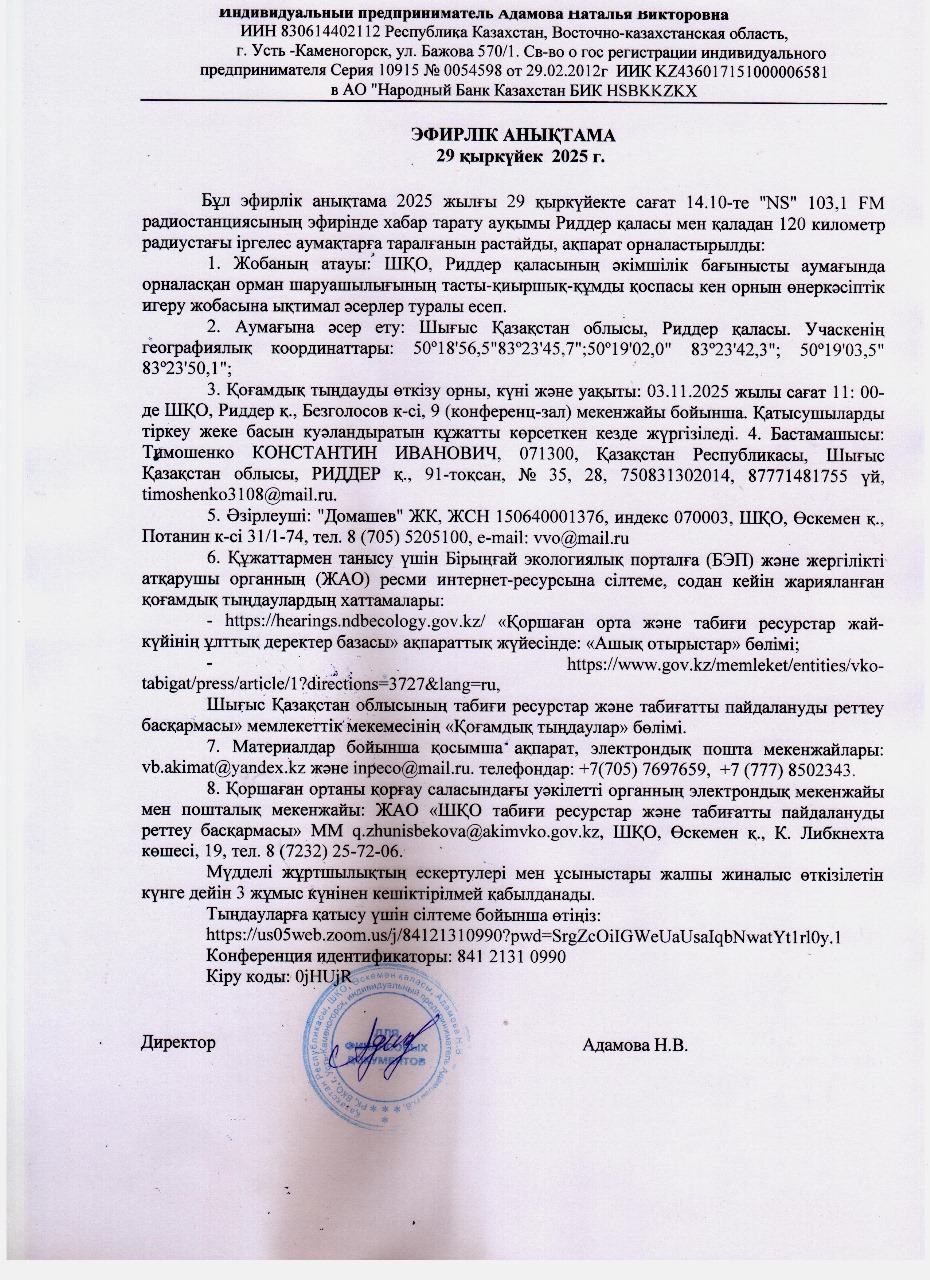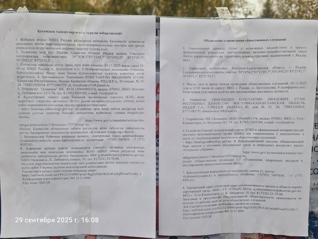 3. Общественные слушания организованны: Управление природных ресурсов и регулирования природопользования Восточно-Казахстанской области, g.zhunisbekova@akimvko.gov.kz,