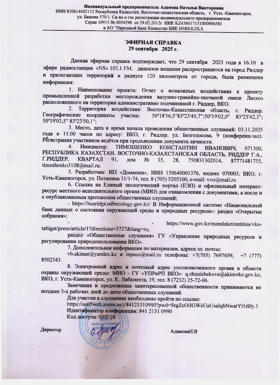 По проекту: Отчет о возможных воздействиях к проекту «Промышленная разработка месторождения валунно-гравийно-песчаной смеси Лесхоз расположенного на территории административно подчиненной г. Риддер ВКО.»