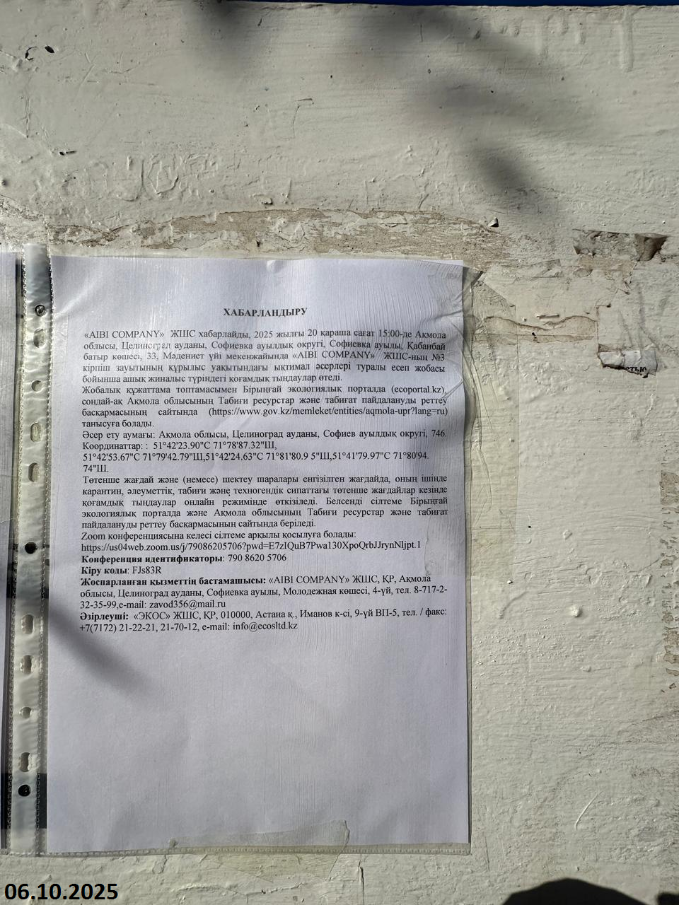 5.4. Дополнительная информация о административно-территориальных единиц: ТОО "ЭКОС" приглашает вас на запланированную конференцию: Zoom. Тема: Общественные слушания ТОО «AIBI COMPANY Время: 20 нояб. 2025 03:00 PM Астана, Алматы Подключиться к конференции Zoom https://us04web.zoom.us/j/79086205706?pwd=E7zIQuB7Pwa130XpoQrbJJrynNljpt.1 Идентификатор конференции: 790 8620 5706 Код доступа: FJs83R