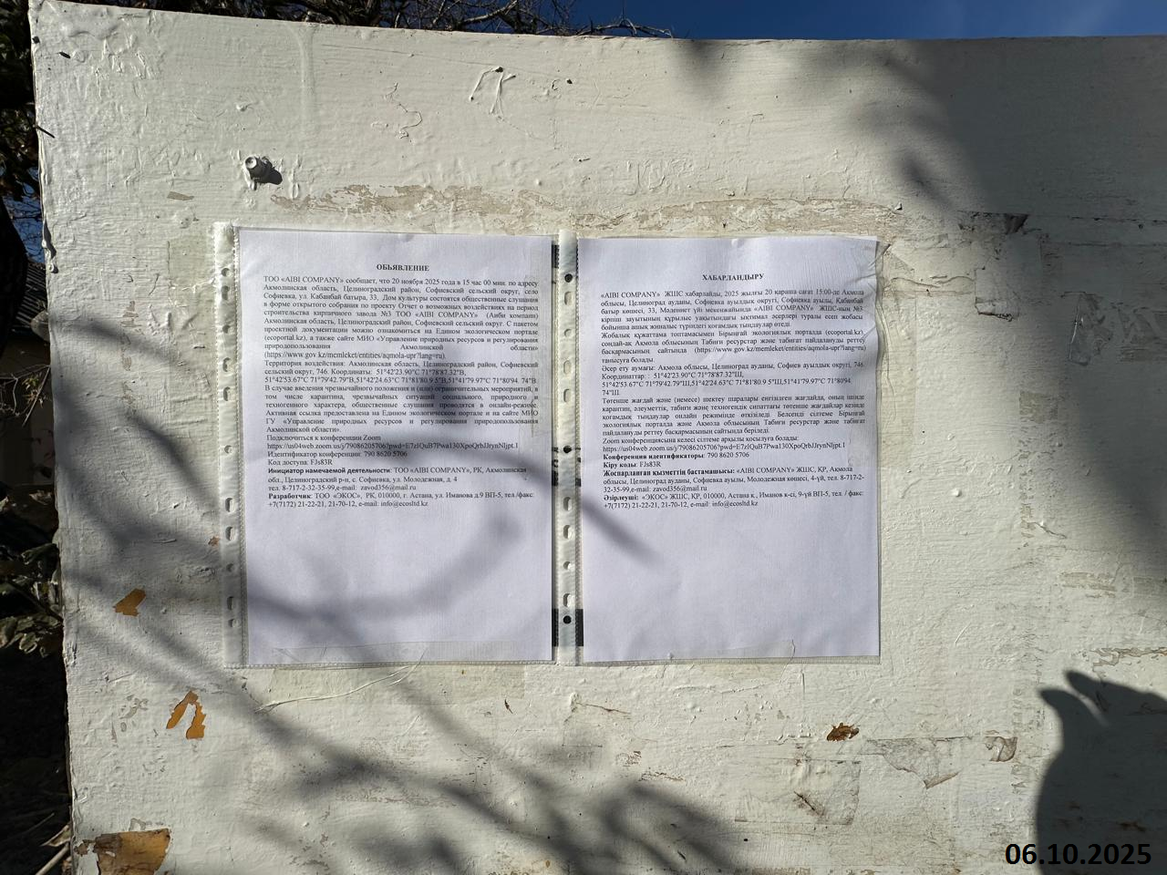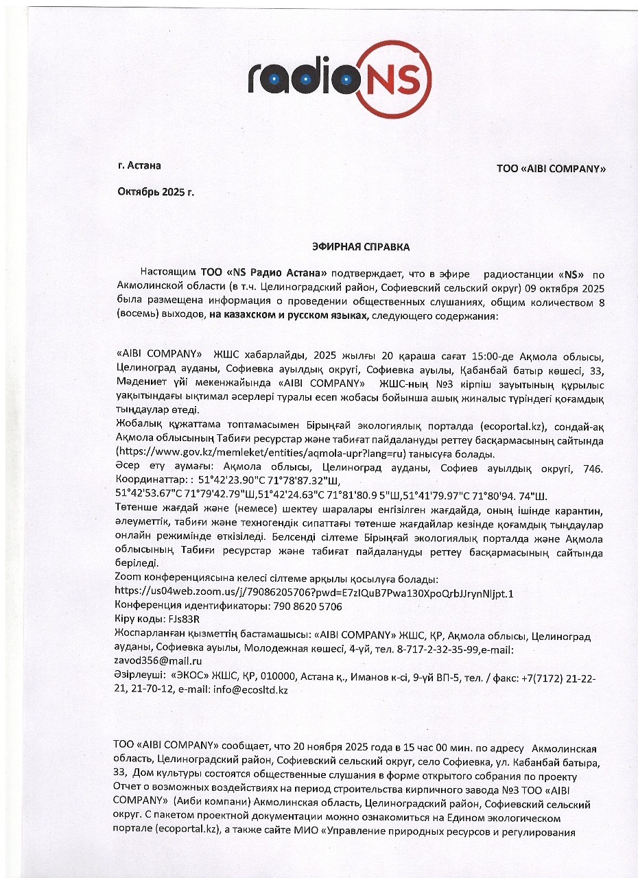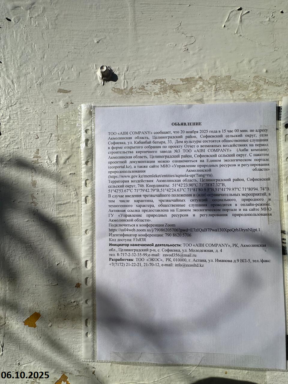 4. Повестка дня общественных слушаний: Площадка завода №3 ТОО «AIBI Company» (Аиби Компани) расположенного на одной площадке с заводом №1 и №2, который находится в Софиевском сельском округе Целиноградского района Акмолинской области. Основной намечаемой деятельностью которого, является производство и реализация кирпича следующих видов: одинарный полнотелый, пустотелый полуторный, полнотелый полуторный. Общая производительность кирпичного завода (№1 и №2) с 2017 года была 80000 шт. кирпича в сутки, в год – 12000000 шт, на 2026-2035 года планируется выпуск 194445 шт в сутки (или 670,9 тонн в сутки) и 35 млн. шт. в год. Главной целью намечаемой деятельности является повышение мощности кирпичного завода и количественное увеличение производства кирпичей. Общая площадь земельного участка, отведенного для проведения работ по совмещенной разведке и добыче кирпичных глин, а также для размещения производственных помещений по производству кирпича составляет 33,0 га. Площадь земельного участка, отведенного для завода по производству кирпича, составляет 2,5 га. Участок, выбранный для размещения кирпичного завода №3 ТОО «AIBI Company», расположен в пределах Софиевского сельского округа Целиноградского района Акмолинской области. Территория характеризуется значительной степенью техногенной трансформации. Ближайшие населенные пункты – села Софиевка и Миновка, расположены юго-западнее от территории размещения карьера на расстоянии более 5 км (с. Софиевка) и юго- восточнее от территории размещения карьера на расстоянии более 4 км (с. Миновка). В зоне влияния объектов кирпичного завода ТОО «AIBI Company» (Аиби Компани) курортов, зон отдыха и объектов с повышенными требованиями к санитарному состоянию атмосферного воздуха не имеется. Постов наблюдений за загрязнением атмосферного воздуха на территории предприятия нет. Рельеф участка пологий, с общим уклоном на северо-запад. Территория характеризуется малой обеспеченностью поверхностными водными объектами. Крупные постоянные водотоки вблизи, р. Селета находится в 7 км от площадки завода. Реализация проекта окажет положительный социальный эффект на жителей близлежащих населенных пунктов п. Софиевка, Миновка за счет дополнительных инвестиций при строительстве завода. Ввод в эксплуатацию завода привлечет местных рабочих кадров из различных профессиональных сфер для выполнения различных работ. Наличие конкретных технических проектных решений обеспечивает существенное снижение возможных форм неблагоприятного воздействия на окружающую среду. Отказ от реализации проектных решений не приведет к значительному улучшению экологических характеристик окружающей среды, так как выбранный участок для строительства уже техногенно изменен, и его текущее состояние не позволит достичь существенного экологического эффекта. Вместе с тем отказ от проекта может повлечь за собой утрату социально и экономически важного для региона предприятия, тогда как с экологической точки зрения подобное решение по сути не изменит ситуацию. В зоне влияния объектов кирпичного завода ТОО «AIBI Company» (Аиби Компани) курортов, зон отдыха и объектов с повышенными требованиями к санитарному состоянию атмосферного воздуха не имеется. Состав компонентов на 1000 шт. кирпича (максимальный расход) следующий: глина – 2,616 т, уголь марки Д АО «Шубарколь комир