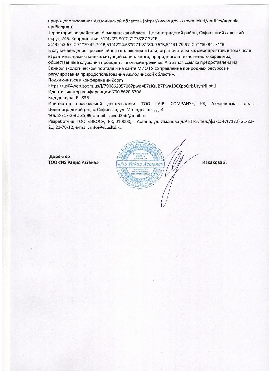 3. Общественные слушания организованны: Управление природных ресурсов и регулирования природопользования Акмолинской области, expeco@mail.ru,