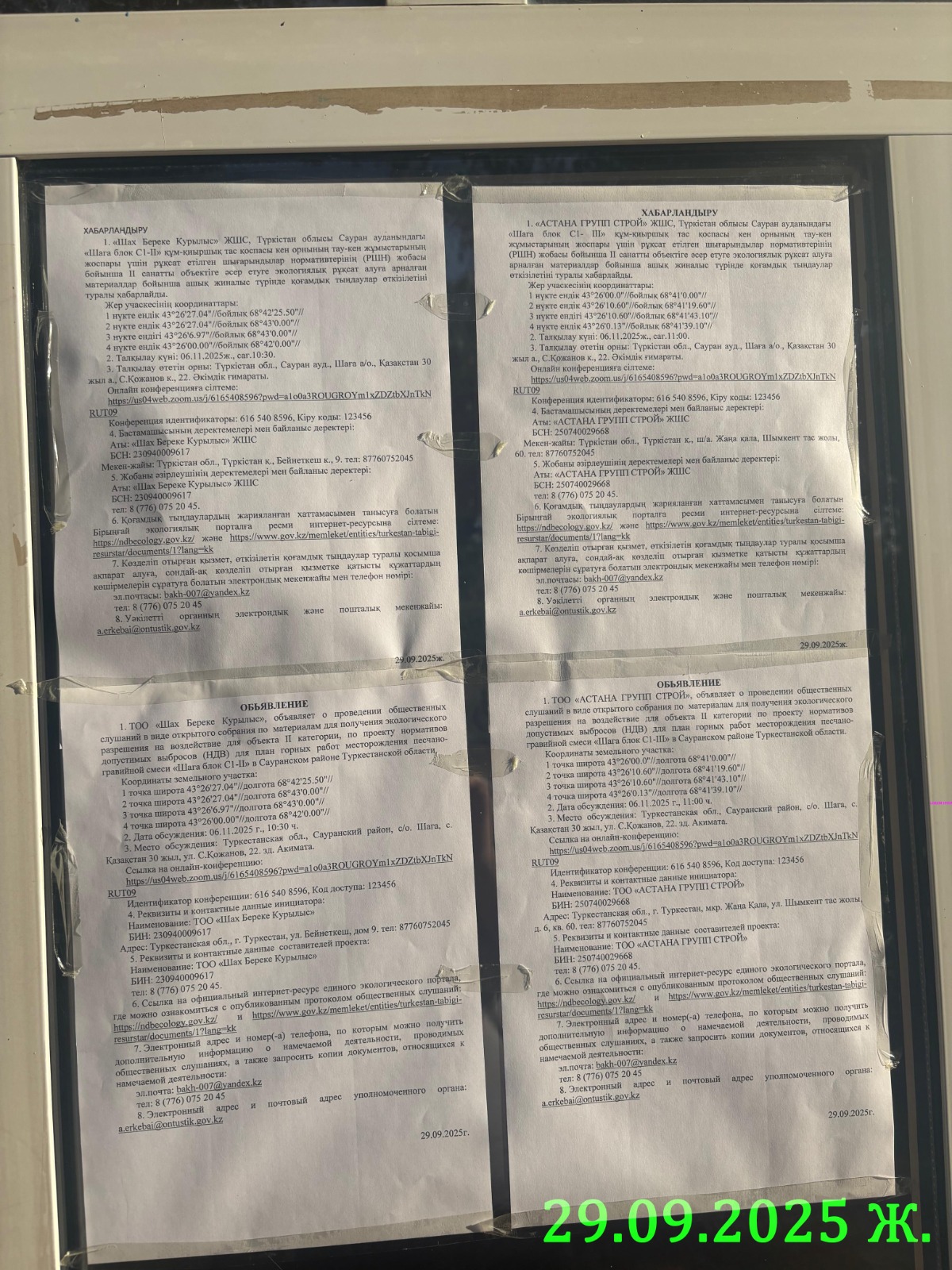 3. Общественные слушания организованны: Управление природных ресурсов и регулирования природопользования Туркестанской области, a.erkebai@ontustik.gov.kz,