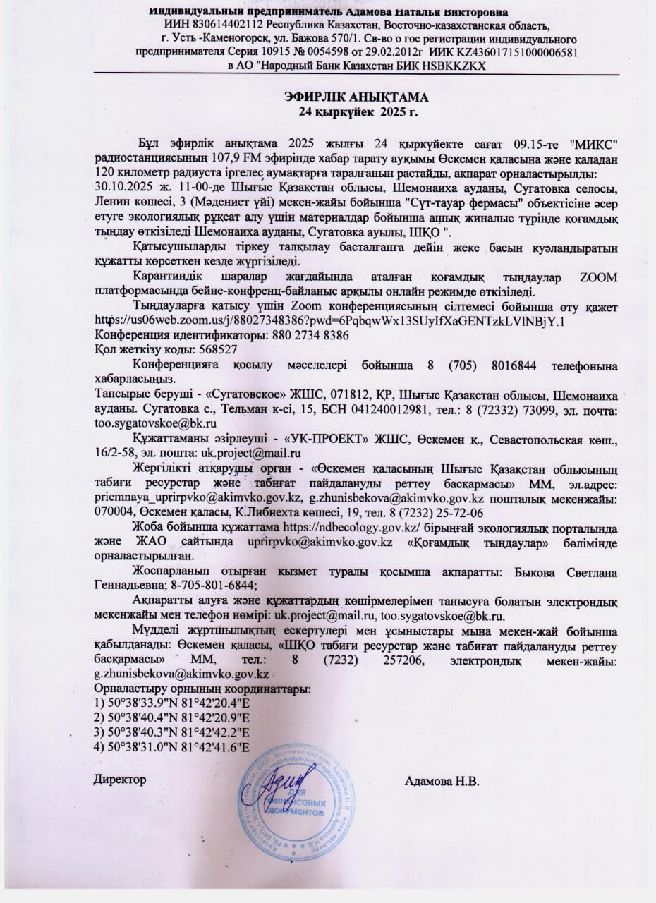 3. Общественные слушания организованны: Управление природных ресурсов и регулирования природопользования Восточно-Казахстанской области, g.zhunisbekova@akimvko.gov.kz,