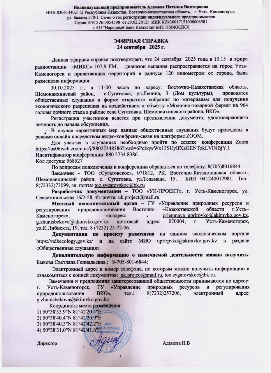 4. Повестка дня общественных слушаний: Местоположение объекта: Строительство МТФ предусматривается в вблизи с.Сугатовка и с.Кенюхово, Шемонаихинского района, ВКО. На расстоянии 1 км., расположена действующая молочно-товарная ферма, что позволит по необходимости использовать существующие здания и сооружения. Площадь участка составляет 24,5011 га. Молочно-товарная ферма (МТФ) рассчитана на содержание 1198 голов скота, проект разработан под содержание скота «Симментальской» породы. Содержание животных рекомендуется в неотапливаемых зданиях. Комфортные условия для содержания животных характеризуются достаточной полезной площадью на одну голову, достаточностью фронта кормления, фронта поения, воздухообмена и сбалансированным рационом кормов. Ближайшая жилая зона (с. Кенюхово) расположена с западной стороны на расстоянии 350 м. Ручей без названия расположен с юго-восточной стороны на расстоянии 210-312 м. Выполнен проект водоохранной полосы и водоохранной зоны, получено положительное заключение на проект установления водоохранной зоны и водоохранной полосы правобережного участка ручья без названия в створах от 1,9 км до 2,4 км вниз по течению от истока, расположенного на территории Шемонаихинского района Восточно-Казахстанской области от 22.08.2024 г. На рассматриваемом участке ручья гидротехнических сооружений нет. Однако запланировано устройство водозащитного вала вдоль течения ручья с целью исключения попадания стоков с ближайшего земельного участка, предназначенного для размещения и эксплуатации молочного комплекса. Объект не входит в водоохранную зону ручья без названия. В результате обследования ТОО «Сугатовское» установлено, что основными загрязнителями атмосферы на предприятии на период эксплуатации является содержание животных, хранение навоза, блочно-модульная котельная. На период строительства на предприятии имеется 17 неорганизованных источника эмиссий в атмосферный воздух. На период эксплуатации на предприятии имеется 6 организованных и 8 неорганизованных источников эмиссий в атмосферный воздух.