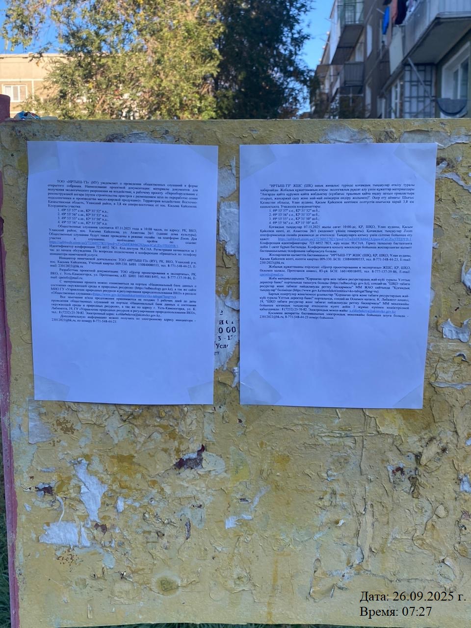 6. Объявление о проведении общественных слушаний на казахском и русском языках будет распространено следующими способами: