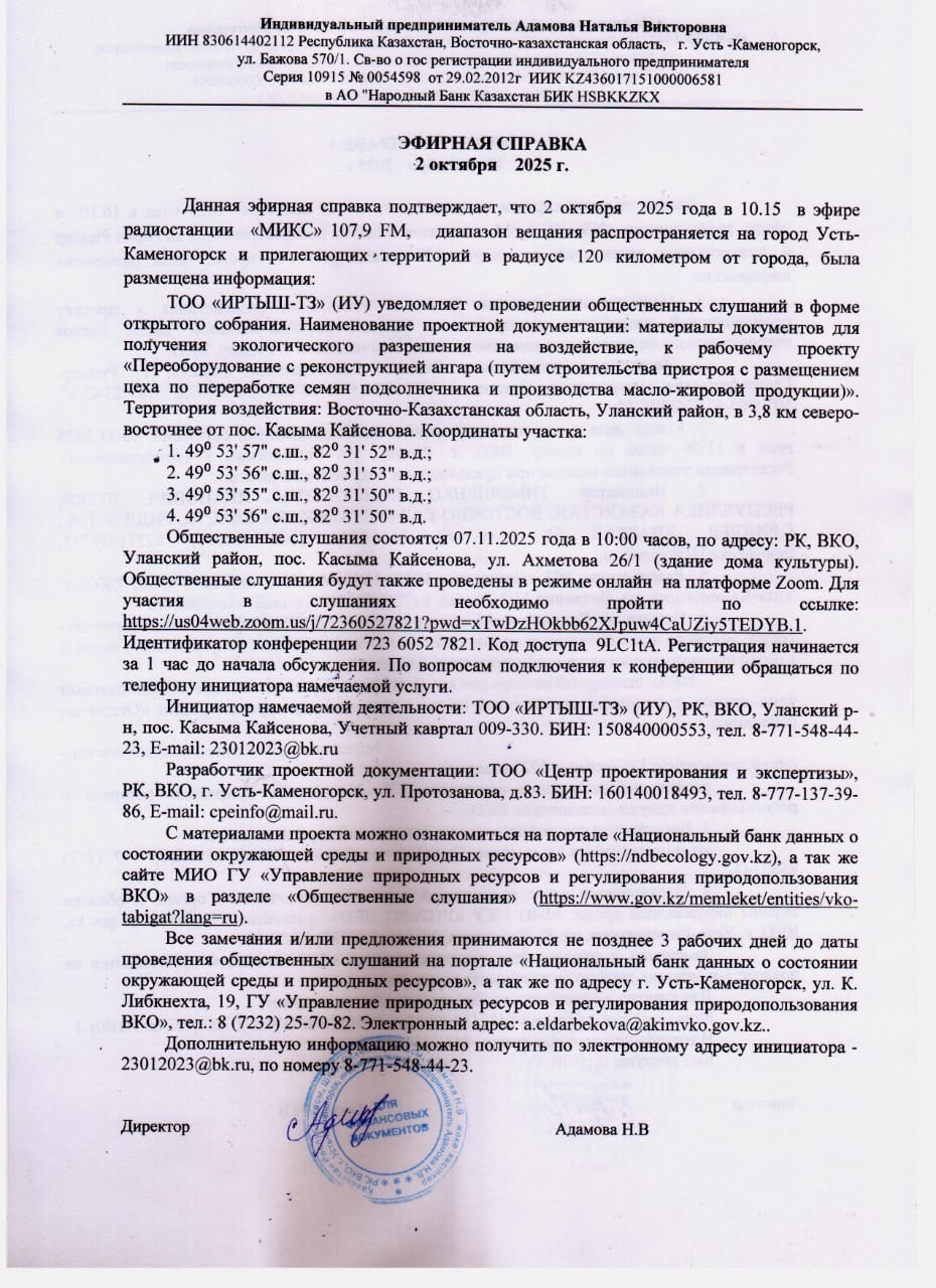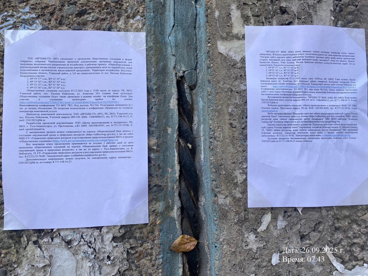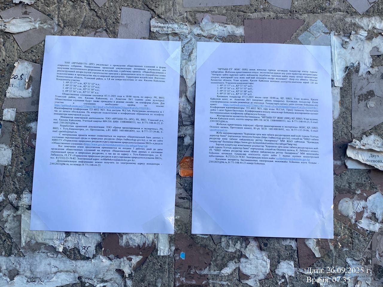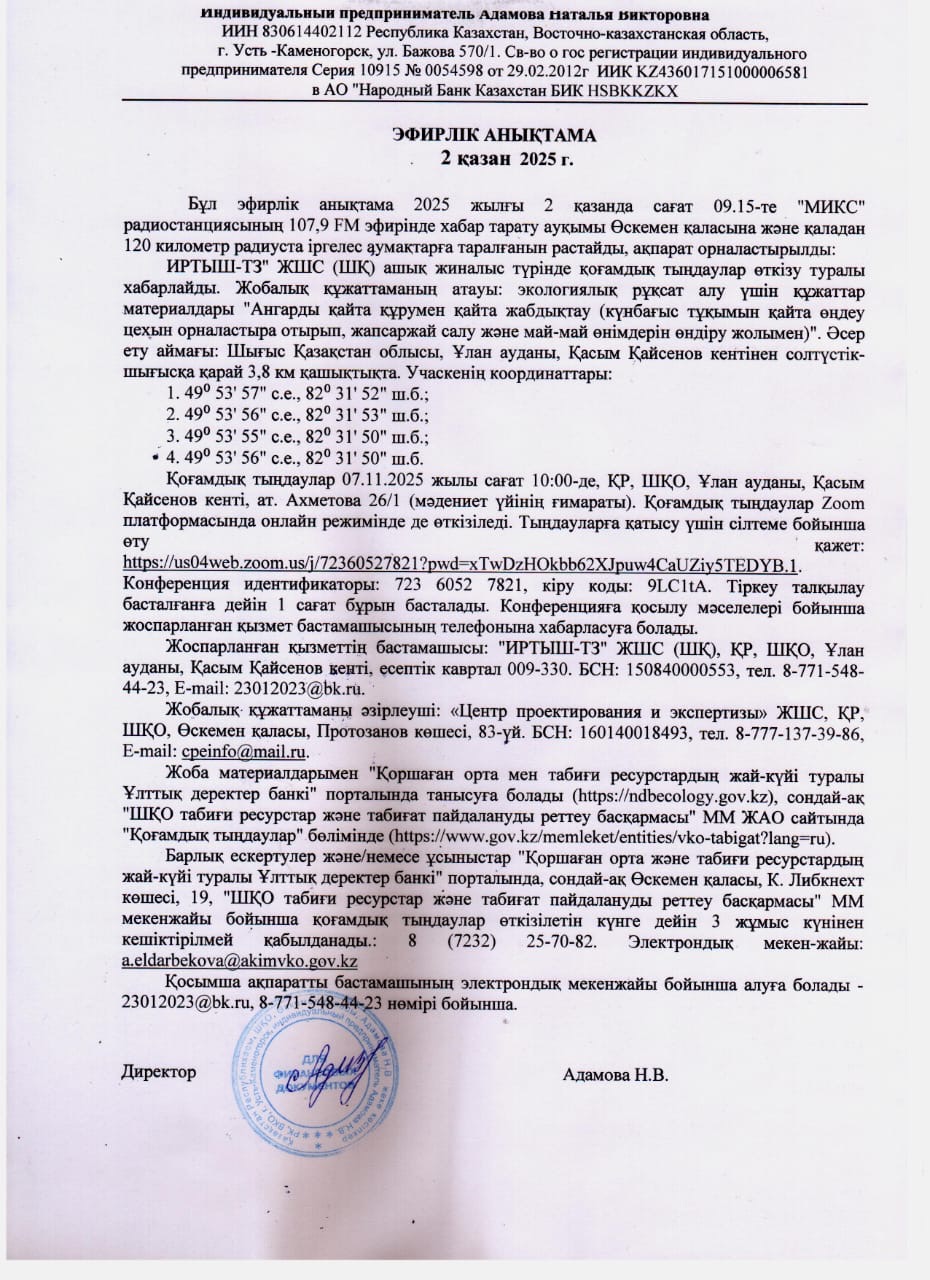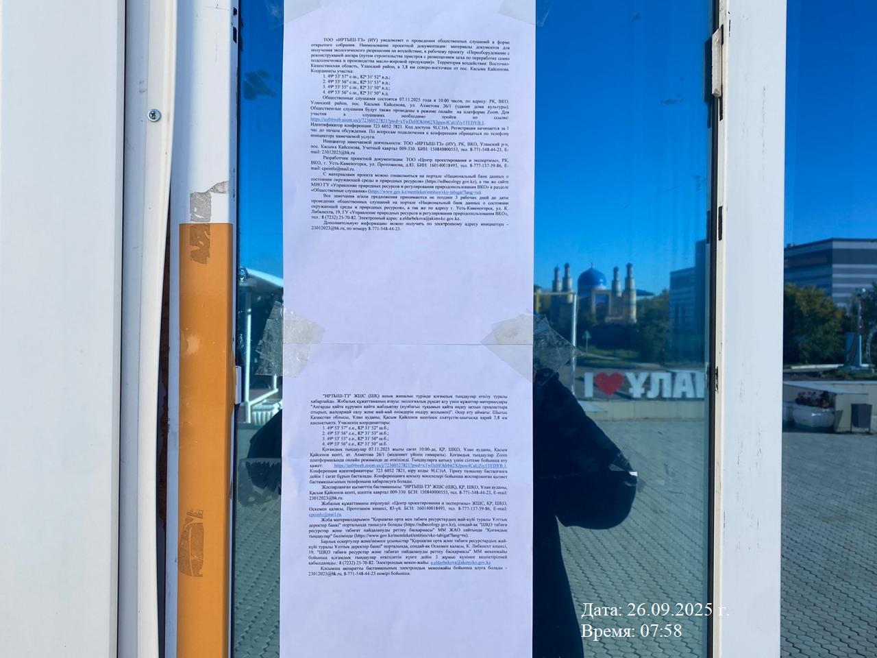 3. Общественные слушания организованны: Управление природных ресурсов и регулирования природопользования Восточно-Казахстанской области, g.zhunisbekova@akimvko.gov.kz,