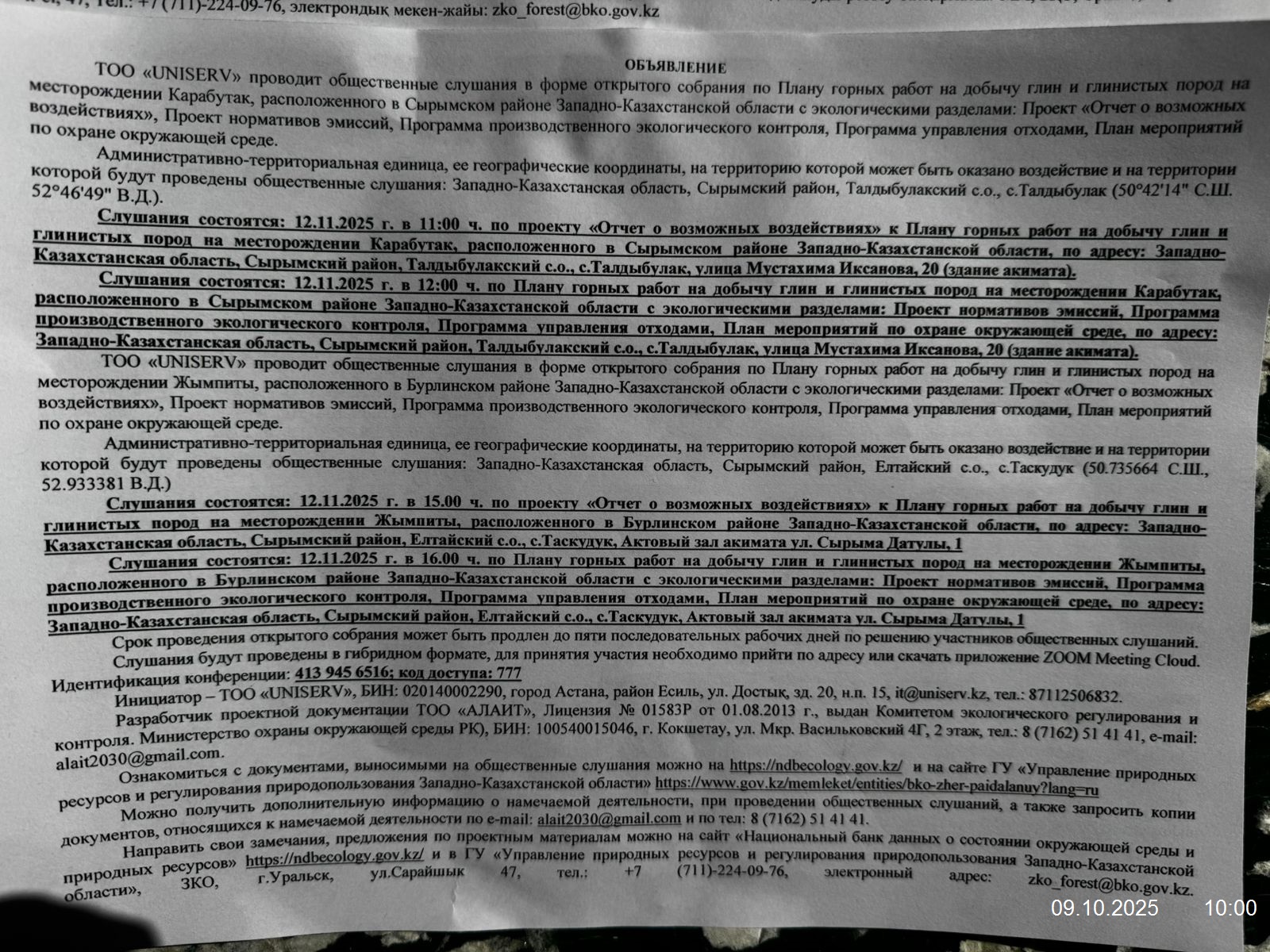 3. Общественные слушания организованны: Управление природных ресурсов и регулирования природопользования Западно-Казахстанской области, zko_forest@bko.gov.kz,